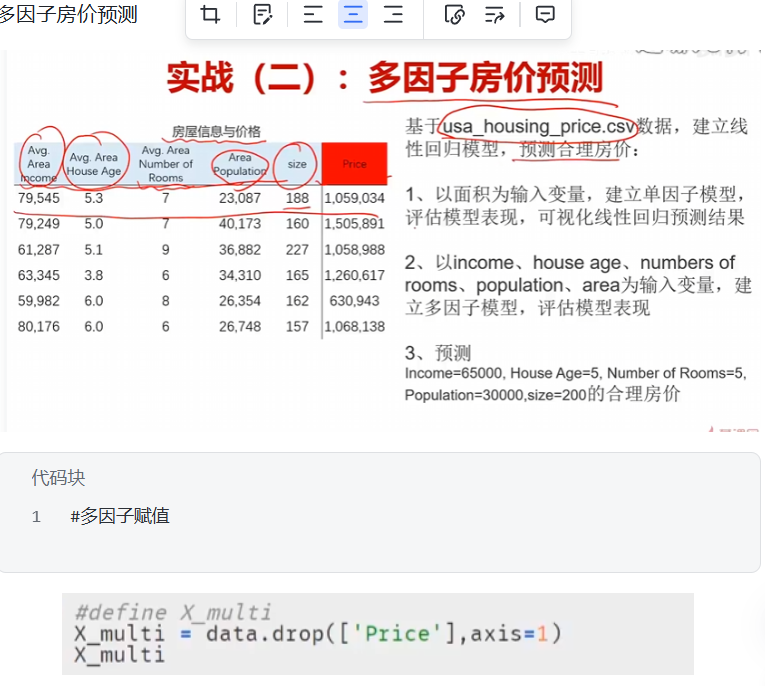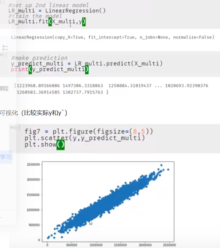 # load the data import pandas as pd data=pd.read("csv文件")#确认数据 data.head()x=data.loc[:,'x'] y=data.loc[:,'y']#可视化 #绘制散点图 from matplotlib import pyplot as plt plt.figure(figsize(20*20)) #设置size plt.scatter(x,y) plt.show()#建立回归模型 import sklearn.linear_model import LinearRegression lr_model=LinearRegression() #把x,y转化成二维数组 import numpy as np x=np.reshape(-1,1) y=np.reshape(-1,1) #确认类型 print(type(x),x.shape,type(y),y.shape) #运行 lr_model.fit(x,y)#预测 y_predict=lr_model.predict(x) #预测x=3.5的值 y_3=lr_model.predict([[3.5]])a//b打印 a=lr_model.coef_ b=lr_model.intercept_ print(a,b)#评估 from sklearn.metrics import mean_squared_error.r2_score MSE=mean_squred_error(y.y_predict) R2=r2_score(y.y_predict) print(MSE,R2)plt.figure() plt.plot(y,y_predict) plt.show()