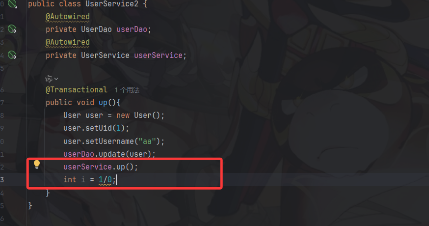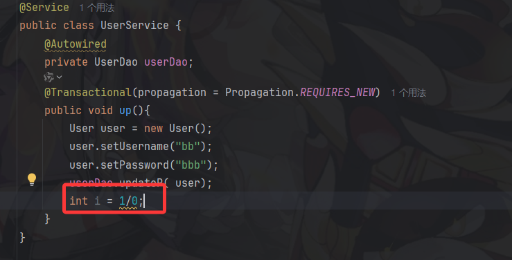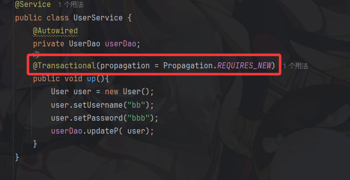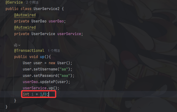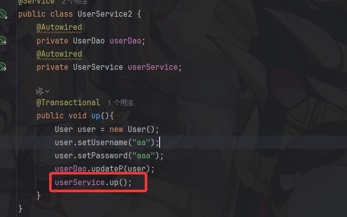 public class UserService2 {@Autowiredprivate UserDao userDao;@Autowiredprivate UserService userService;@Transactionalpublic void up(){User user = new User();user.setUid(2);user.setUsername("aa");userDao.update(user);userService.up();}