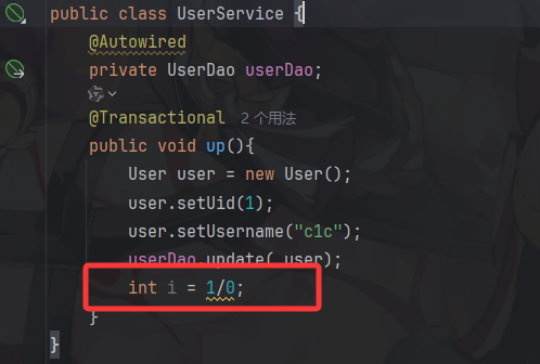public class UserService {@Autowiredprivate UserDao userDao;@Transactionalpublic void up(){User user = new User();user.setUid(1);user.setUsername("cc");userDao.update( user);}