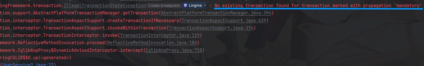 将内部事务行为改为MANDATORY,然后将外部的注解删除,尽管代码没有问题依旧会报错。