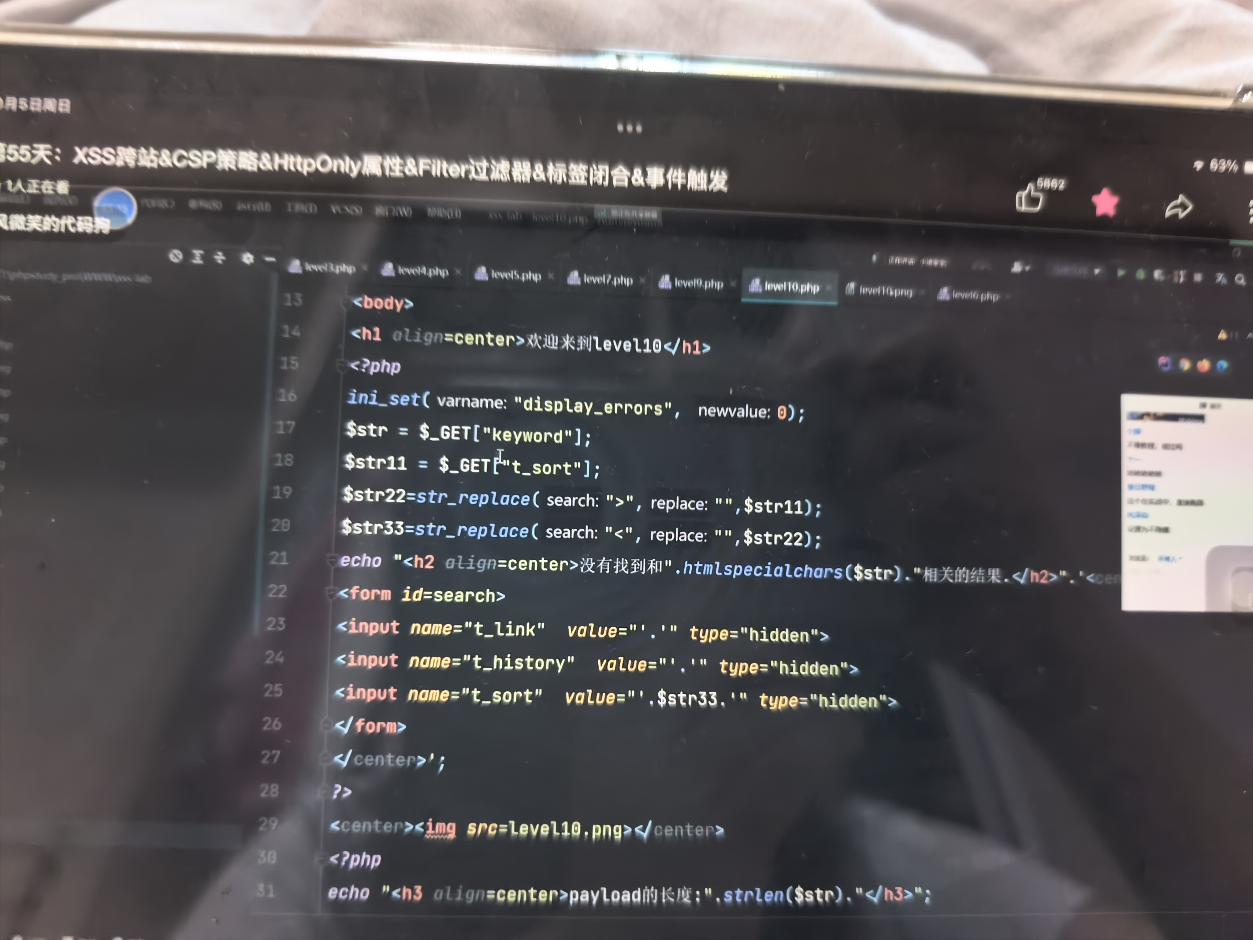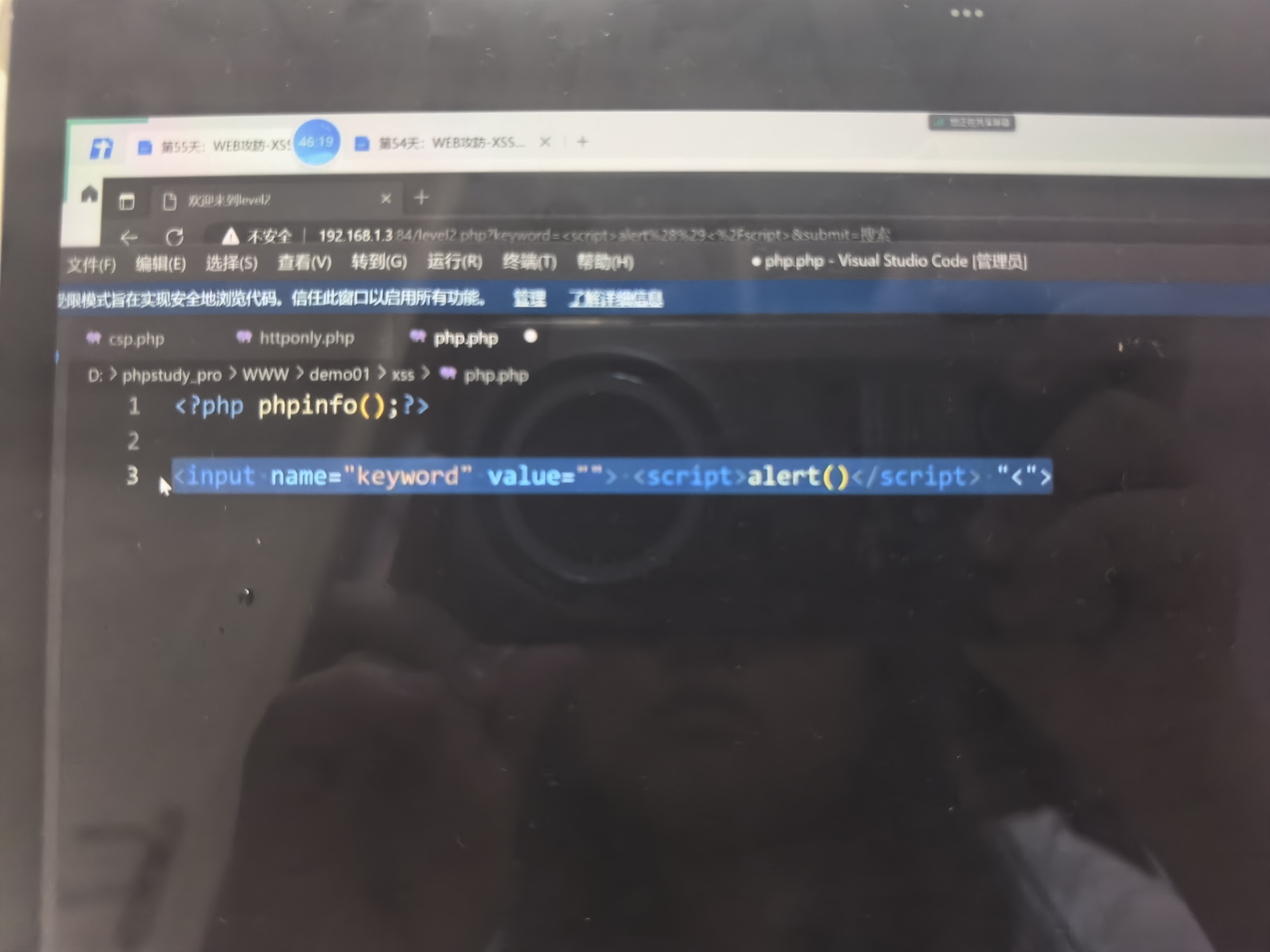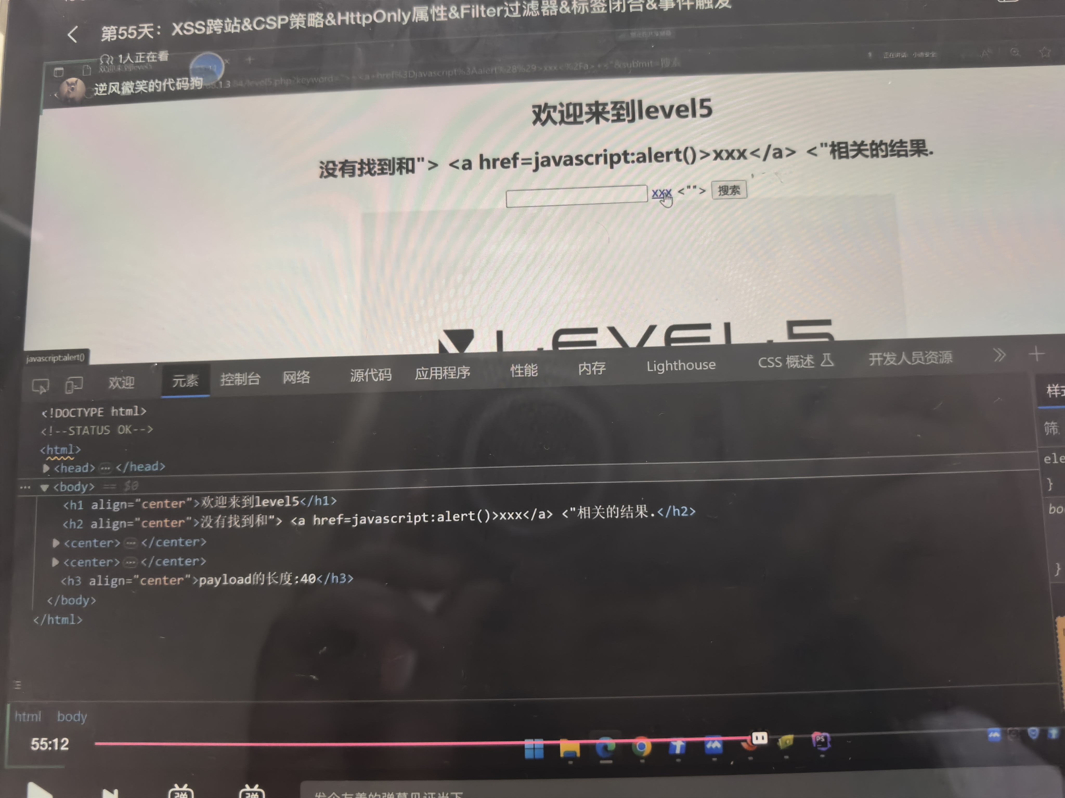 下一关的话可以利用其他的标签,把这个标签闭合掉,然后自己创造一个其他的标签,和注入特别像。