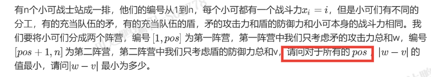 首先正序递推求出a[i](表示从1到 i 的矛的权值),若该位非0,就继承上一位a[i-1]的权值,若该位为0,额外增加下标的收益 i,逆序递推从n到i求出b[i](表示从 i 到 n 盾的权值) ,若该位非1,就继承下一位b[i+1]位的权值若该位为1,额外增加下标的收益 i ,若该位非1,就继承下一位b[i+1]位的权值,从1到n遍历分割点,分割点i的权值就是abs(a[i],b[i+1]),比较存储i的权值的最小(注意i的范围要从0到n+1)