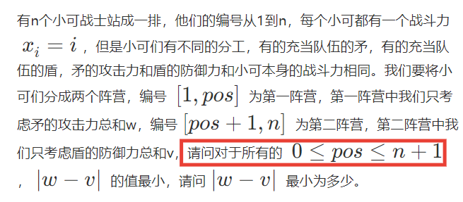 long long w[100005],v[100005];//w[i]表示从1到i矛的攻击力总和,v[i]表示从n到i盾的防御力总和