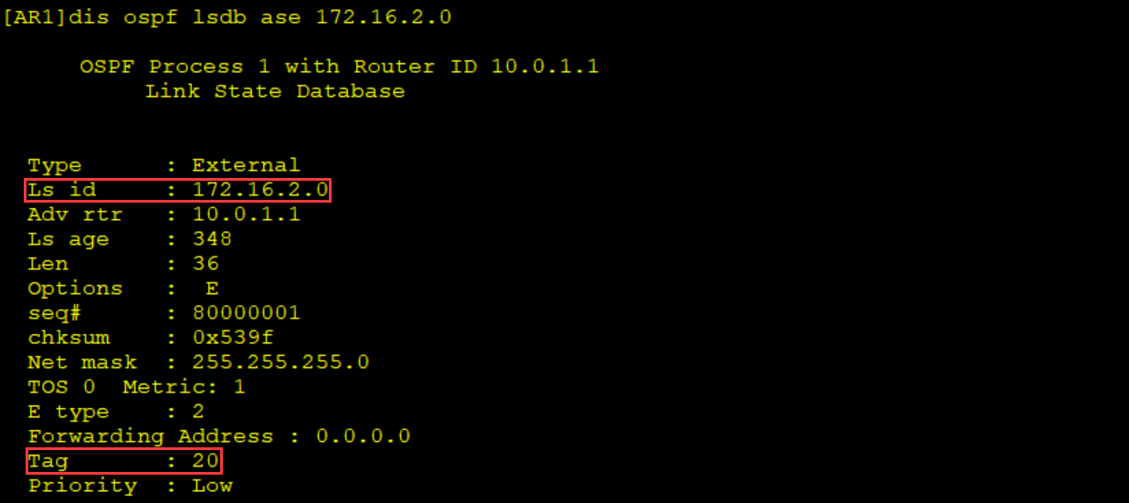 # 在R1上查看OSPF LSDB中AS-external LSA 172.16.2.0的相关信息