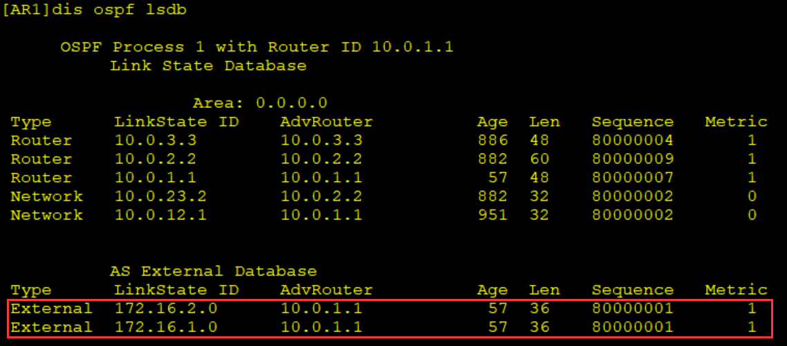 在OSPF路由表以及IP路由表中都可以看到OSPF外部路由172.16.1.0/24、172.16.2.0/24。
