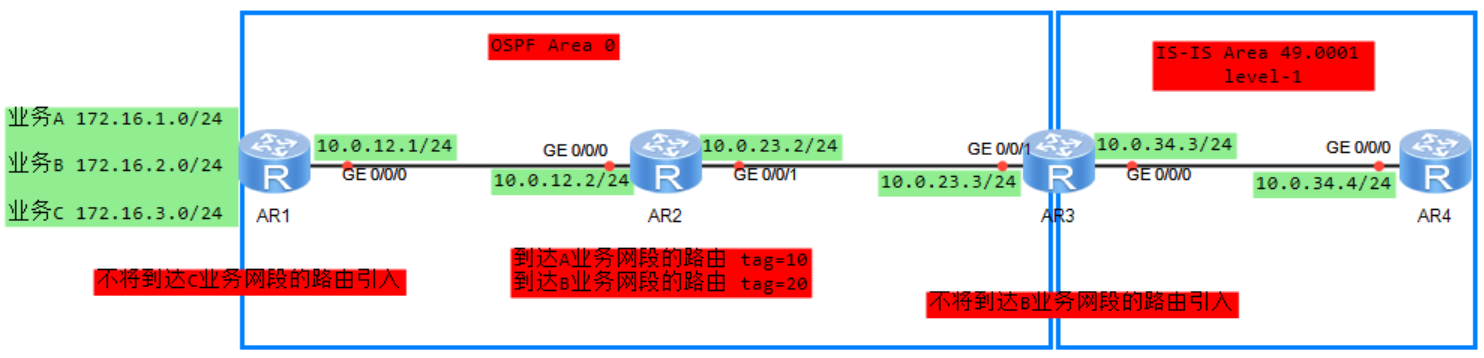 IS-IS域内的路由器需要访问A业务,因此需要在R3上执行路由重分发,将OSPF 路由引入到lS-IS,但是IS-IS域内的路由器不需要访问B业务,为此在R1上引入直连路由时为A、B业务网段路由打上不同的路由标记,R3上执行重分发时根据路由标记过滤B业务网段路由。