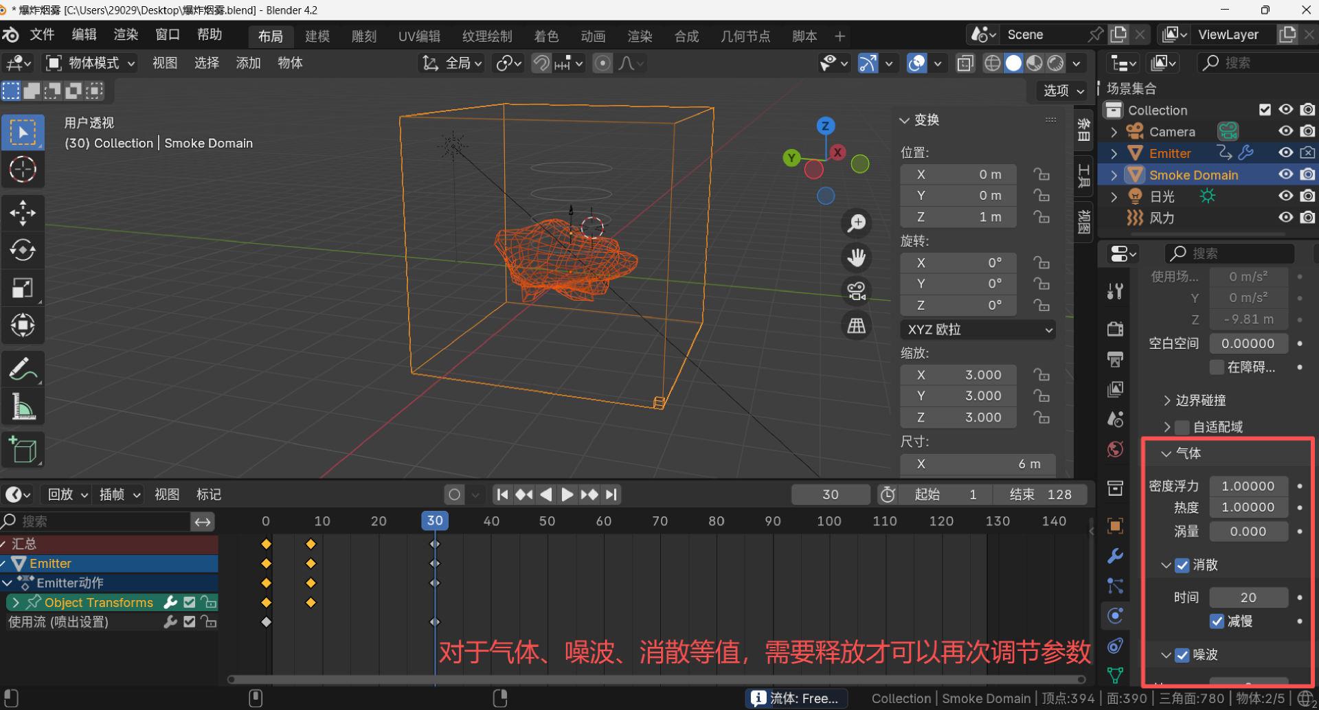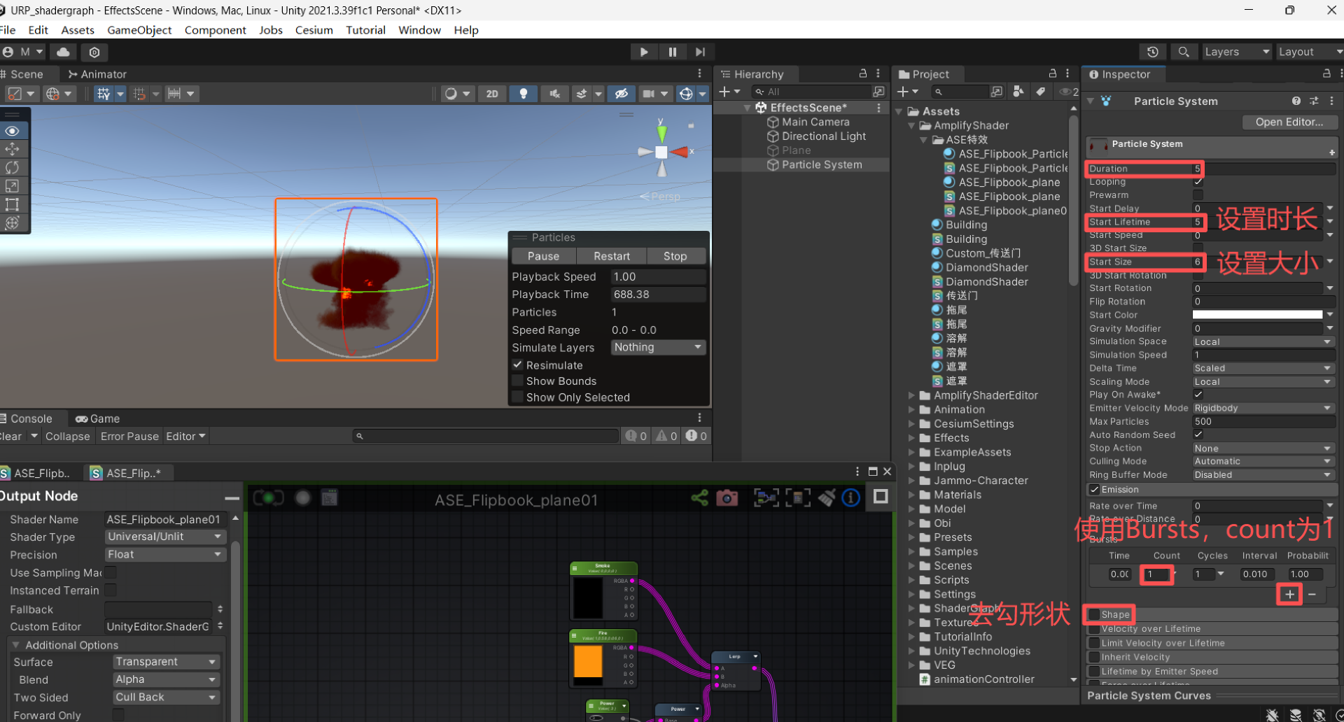 设置粒子系统的生命周期,发射速度,粒子个数,发射数量,形状,渲染类型等。