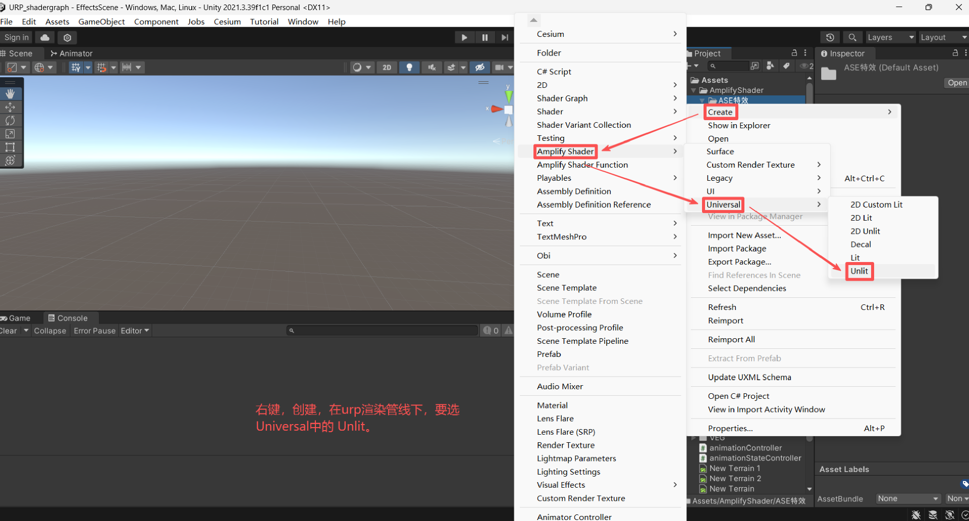 创建一个Amplify Shader Editor,本项目使用URP渲染管线,要使用Universal下的Unlit。