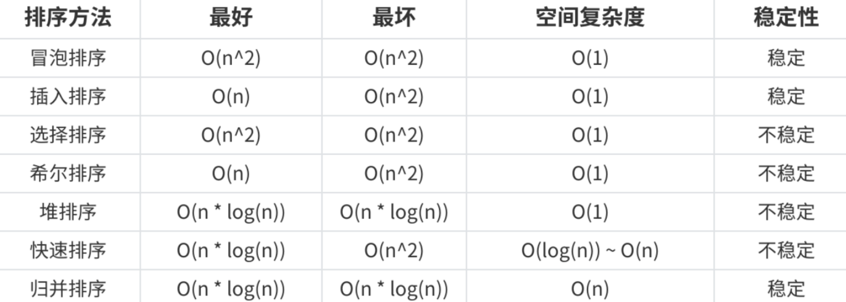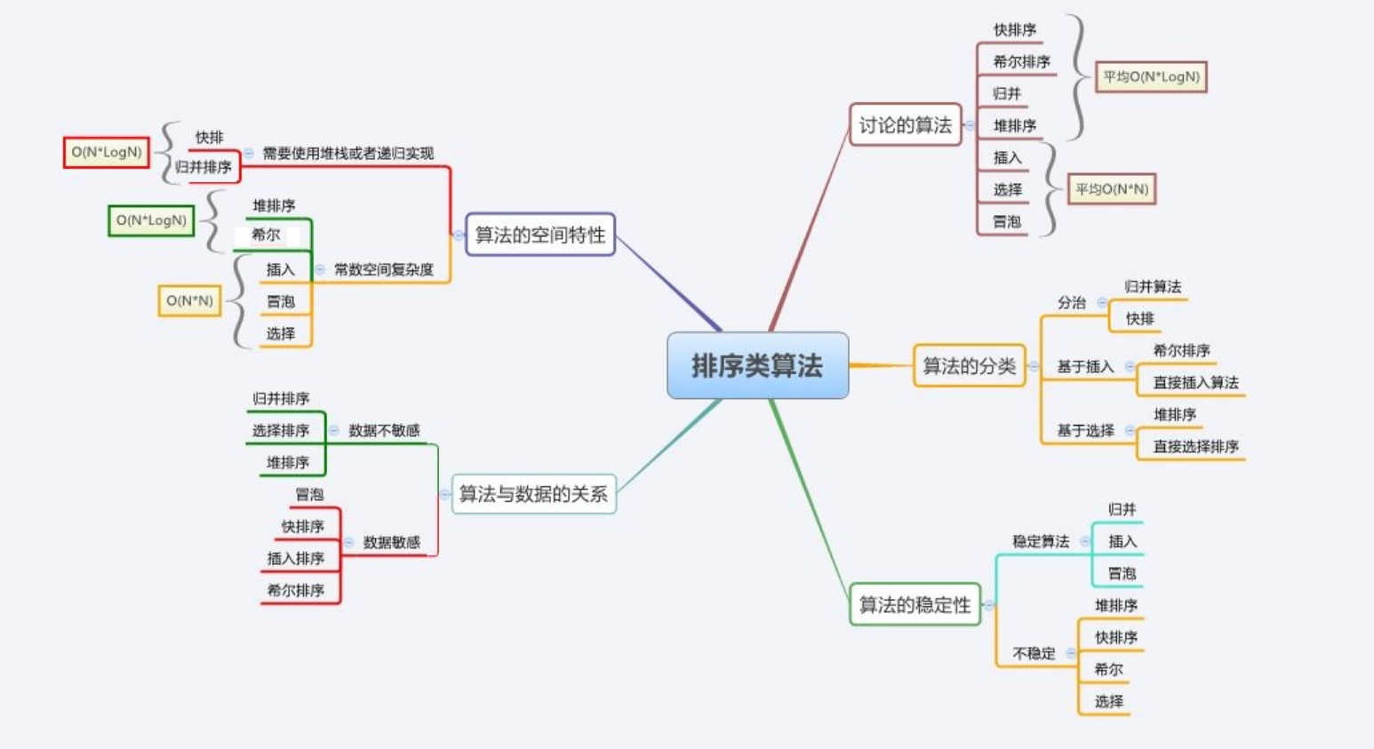 也就是将几种排序分类,有快排,归并使用分治的思想,还有时间复杂度,空间复杂度,可以看出来,堆、快排、归并时间复杂度都是比较快的,