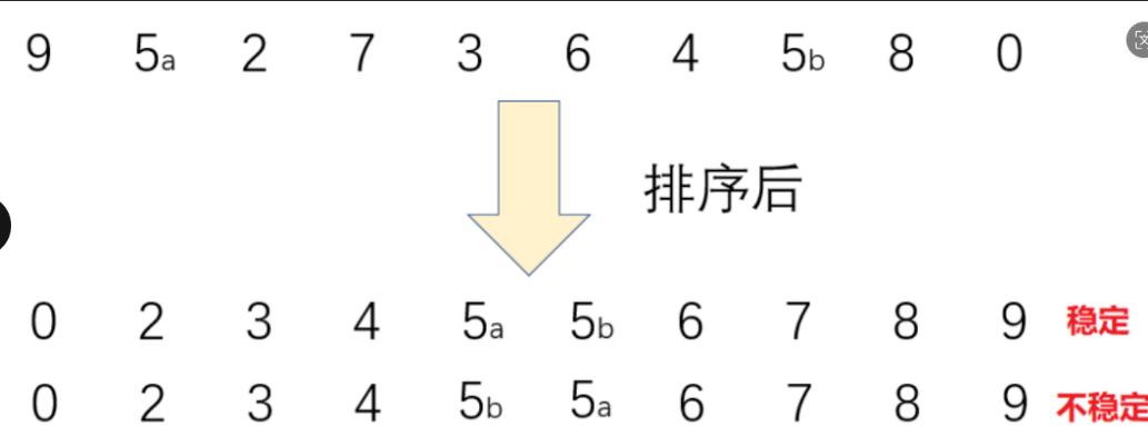 排序之前,2a在2b前面,排序后也能保证2a在2b前面,就认为稳定。