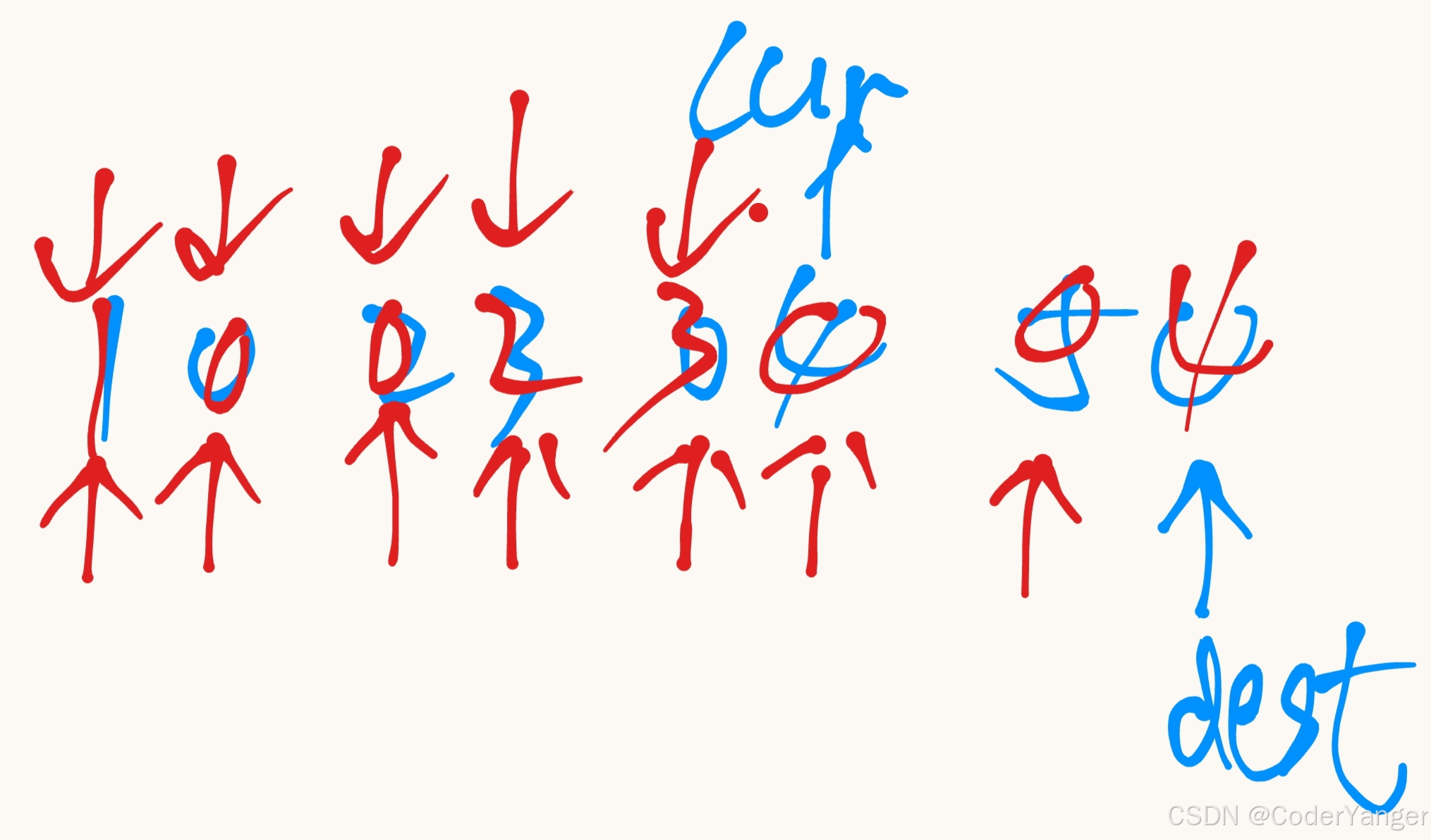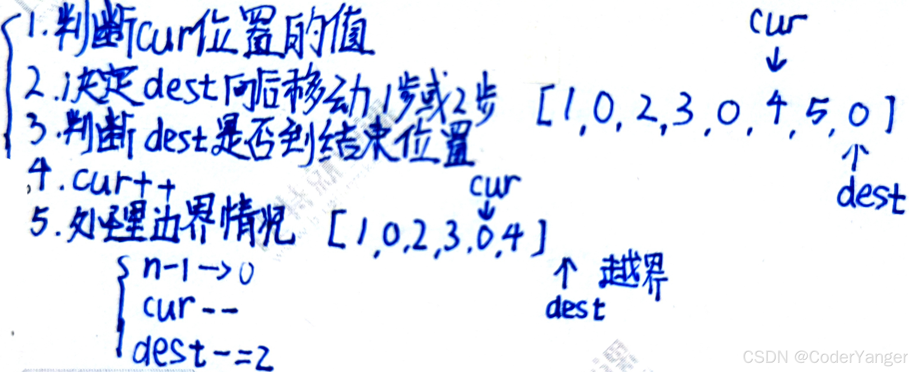 a. 初始化两个指针 cur = 0 , dest = 0 ;b. 找到最后⼀个复写的数:i. 当 cur < n 的时候,⼀直执⾏下⾯循环:•判断 cur 位置的元素:◦如果是 0 的话, dest 往后移动两位;◦否则, dest 往后移动⼀位。•判断 dest 时候已经到结束位置,如果结束就终⽌循环;•如果没有结束, cur++ ,继续判断。c. 判断 dest 是否越界到 n 的位置:i. 如果越界,执⾏下⾯三步:1. n - 1 位置的值修改成 0 ;2. cur 向前移动⼀步;3. dest 向前移动两步。d. 从 cur 位置开始往前遍历原数组,依次还原出复写后的结果数组:i. 判断 cur 位置的值:1. 如果是 0 : dest 以及 dest - 1 位置修改成 0 , dest -= 2 ;2. 如果⾮零: dest 位置修改成 0 , dest -= 1 ;ii. cur-- ,复写下⼀个位置