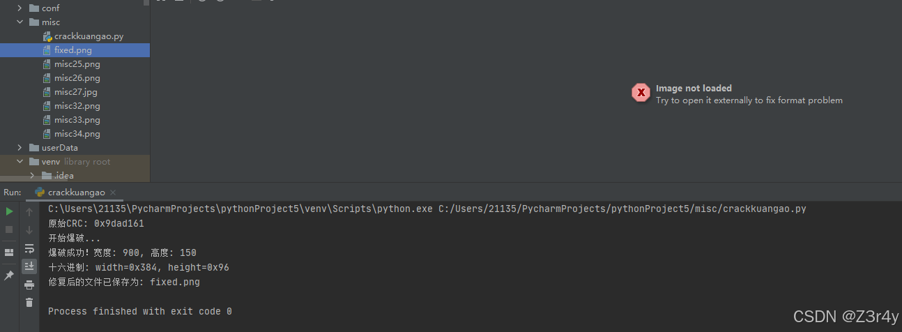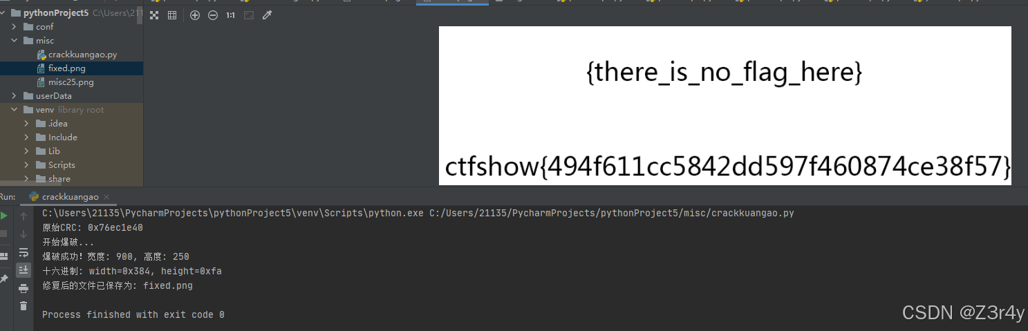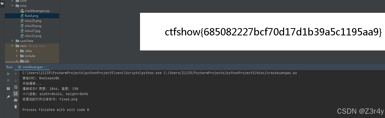 for i in range(1, 4000):for j in range(1, 4000):# 构建数据:IHDR + 宽度 + 高度 + 固定数据data = chunk_type + struct.pack('>i', i) + struct.pack('>i', j) + fixed_datacrc32 = binascii.crc32(data) & 0xffffffffif crc32 == crc32frombp:print(f"爆破成功!宽度: {i}, 高度: {j}")print(f"十六进制: width={hex(i)}, height={hex(j)}")# 可选:修复文件repaired_data = crcbp[:16] + struct.pack('>i', i) + struct.pack('>i', j) + crcbp[24:]with open("fixed.png", "wb") as f:f.write(repaired_data)print("修复后的文件已保存为: fixed.png")exit(0)print("在1-4000范围内未找到正确的宽高")
