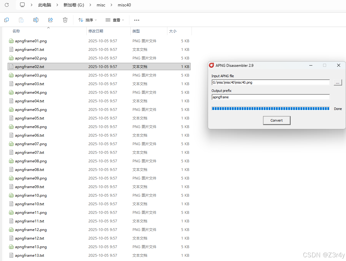 for i in range(1,69):if(i<10):f = open('G:/misc/misc40/apngframe0'+str(i)+'.txt')else:f = open('G:/misc/misc40/apngframe'+str(i)+'.txt')s = f.read()flag += chr(int(s.split("/")[0][6:]))