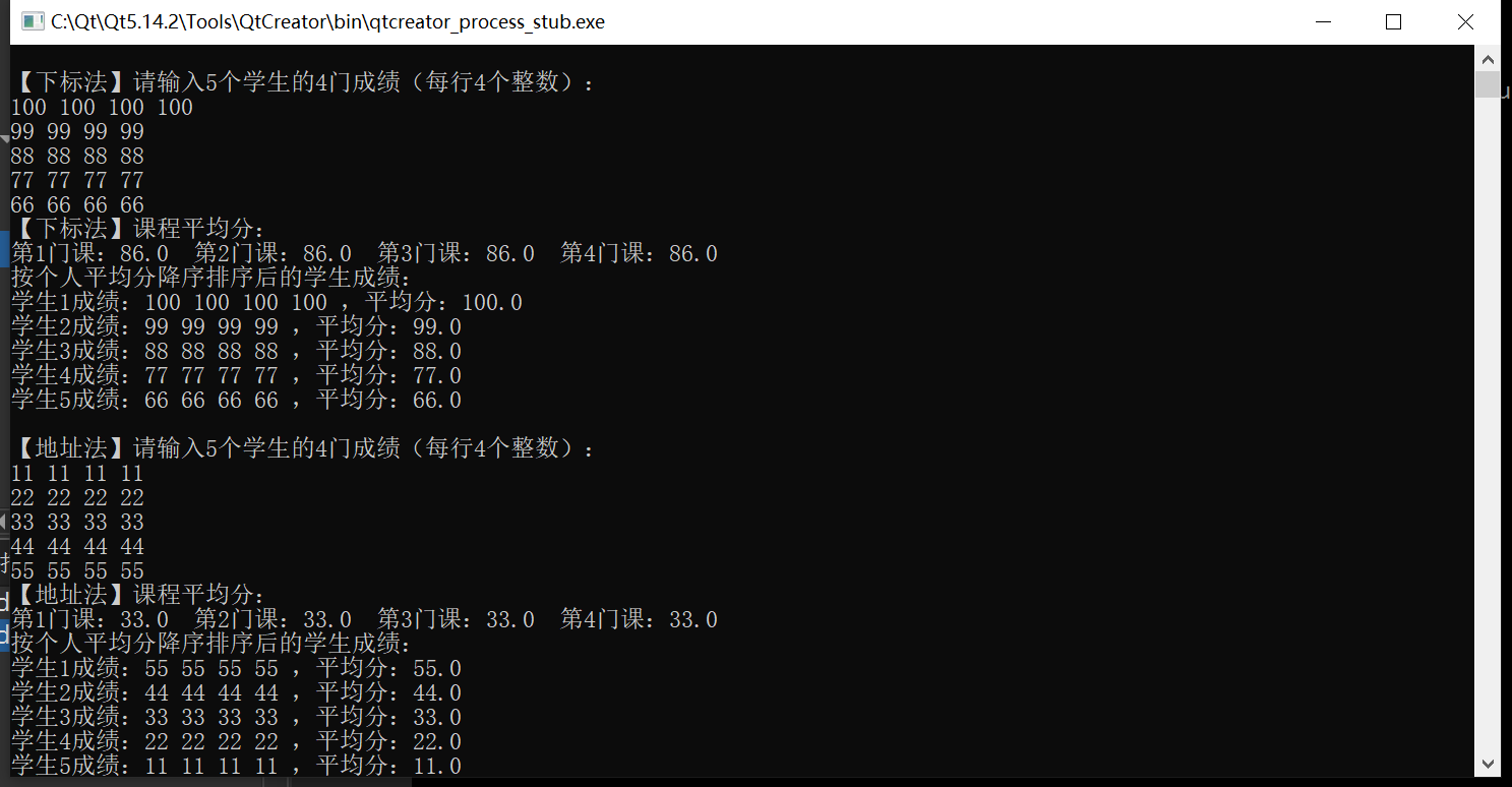 {Student students[STUDENT_COUNT];float courseAvg[COURSE_COUNT] = {0}; // 每门课的平均分// 1. 输入成绩并计算个人平均分和课程总分cout << "\n【下标法】请输入" << STUDENT_COUNT << "个学生的" << COURSE_COUNT << "门成绩(每行" << COURSE_COUNT << "个整数):" << endl;for (int i = 0; i < STUDENT_COUNT; ++i){float sum = 0; // 个人总分for (int j = 0; j < COURSE_COUNT; ++j){cin >> students[i].scores[j]; // 下标访问成绩sum += students[i].scores[j];courseAvg[j] += students[i].scores[j]; // 累加课程总分}students[i].avg = sum / COURSE_COUNT; // 计算个人平均分}// 2. 计算每门课程的平均分for (int j = 0; j < COURSE_COUNT; ++j){courseAvg[j] /= STUDENT_COUNT;}// 3. 按个人平均分降序排序(冒泡排序,下标访问)for (int i = 0; i < STUDENT_COUNT - 1; ++i){for (int j = 0; j < STUDENT_COUNT - 1 - i; ++j){if (students[j].avg < students[j + 1].avg){swap(students[j], students[j + 1]); // 交换学生信息}}}// 4. 输出结果cout << "【下标法】课程平均分:" << endl;for (int j = 0; j < COURSE_COUNT; ++j){cout << "第" << j + 1 << "门课:" << fixed << setprecision(1) << courseAvg[j] << " ";}cout << "\n按个人平均分降序排序后的学生成绩:" << endl;for (int i = 0; i < STUDENT_COUNT; ++i){cout << "学生" << i + 1 << "成绩:";for (int j = 0; j < COURSE_COUNT; ++j){cout << students[i].scores[j] << " ";}cout << ",平均分:" << students[i].avg << endl;}