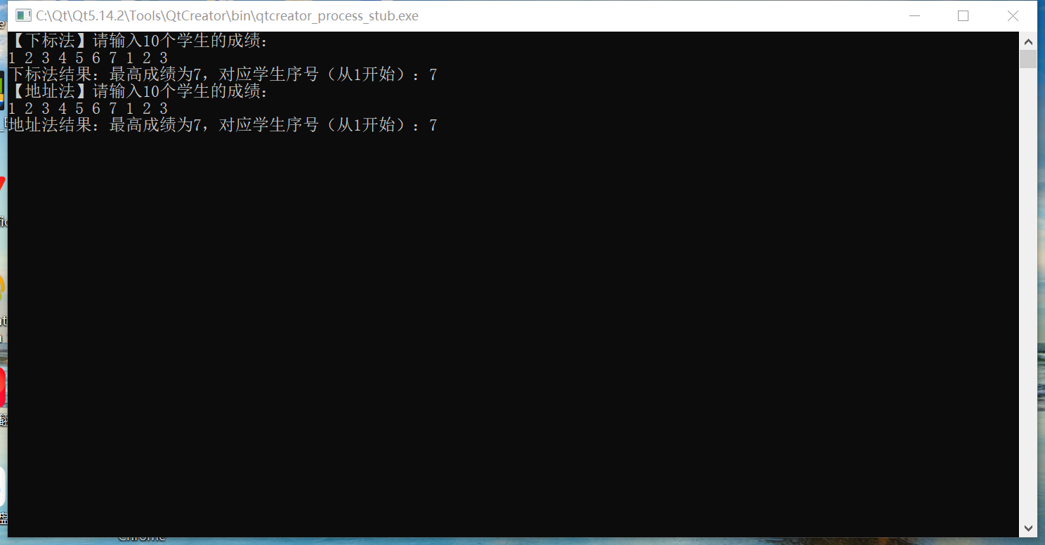 {int scores[STUDENT_COUNT];int maxScore, maxIndex;int* p; // 指针用于访问数组// 输入成绩(指针访问)cout << "【地址法】请输入" << STUDENT_COUNT << "个学生的成绩:" << endl;for (p = scores; p < scores + STUDENT_COUNT; ++p){cin >> *p; // 通过指针解引用赋值}// 初始化最高成绩和索引maxScore = *scores; // 等价于scores[0]maxIndex = 0;// 遍历数组(指针访问)for (p = scores + 1; p < scores + STUDENT_COUNT; ++p){if (*p > maxScore) {maxScore = *p;maxIndex = p - scores; // 指针差值即下标}}cout << "地址法结果:最高成绩为" << maxScore << ",对应学生序号(从1开始):" << maxIndex + 1 << endl;