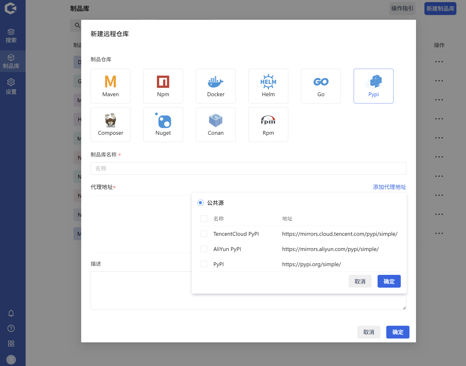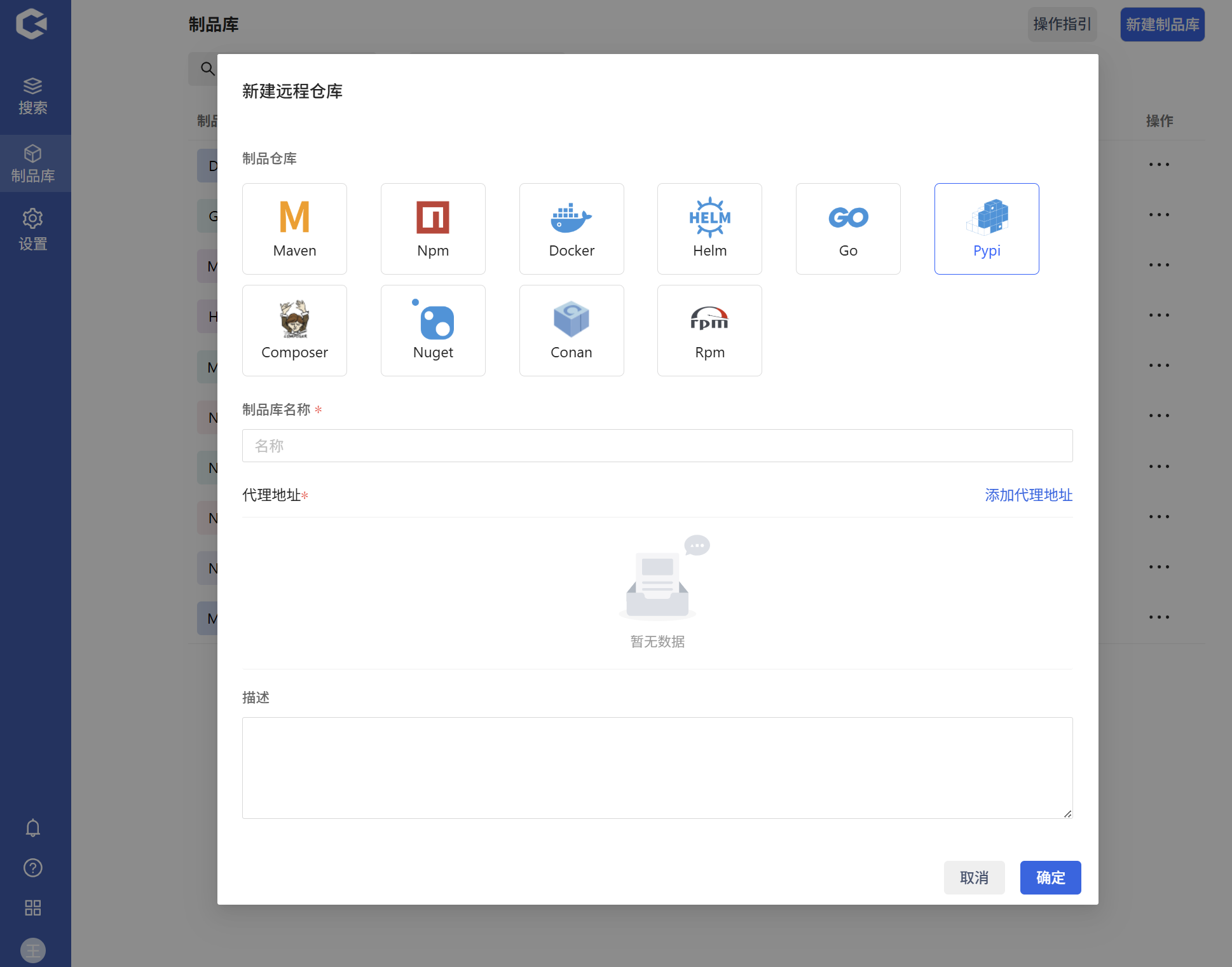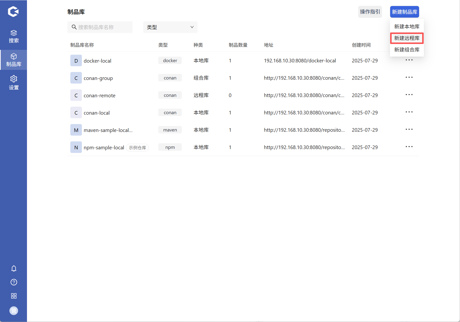 - 打开创建远程库界面:点击新建制品库选择新建远程库输入信息点击确认