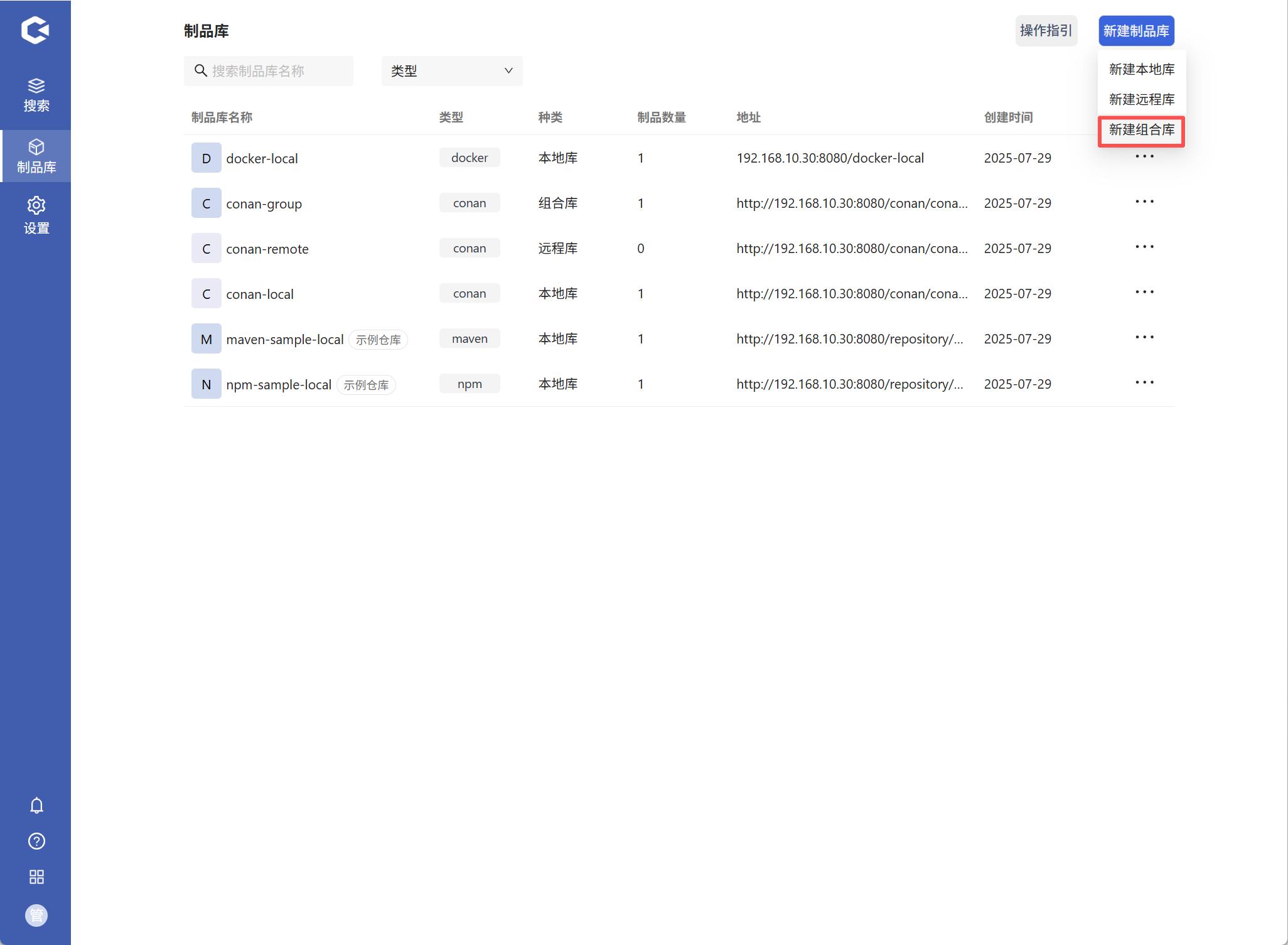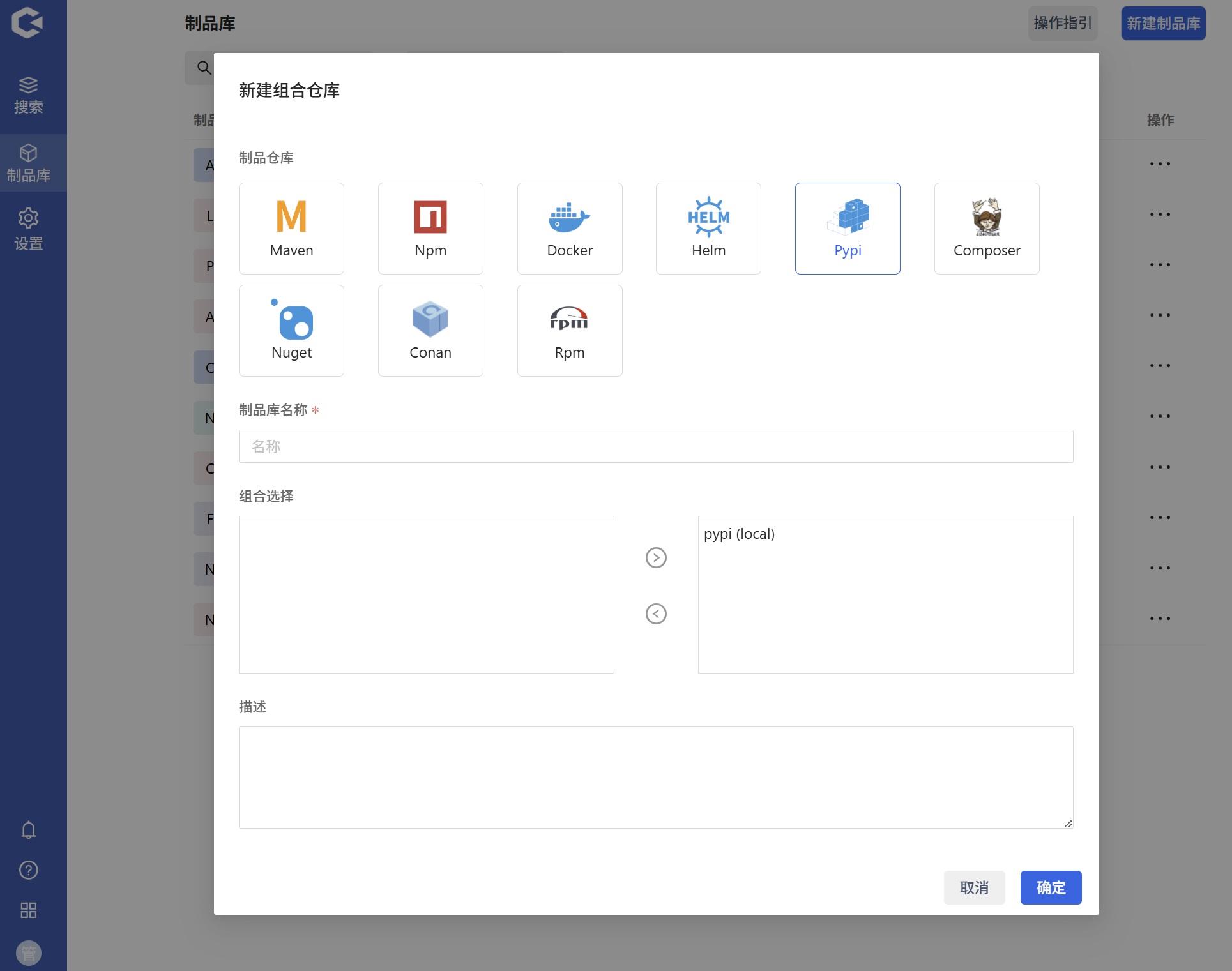 - 打开创建远程库界面:点击新建制品库选择新建组合库输入信息点击确认