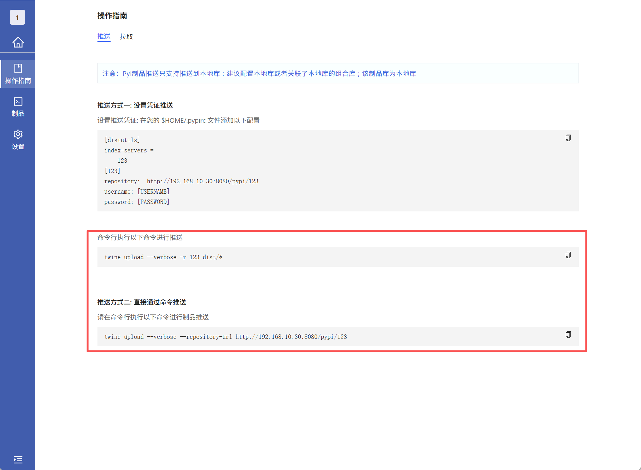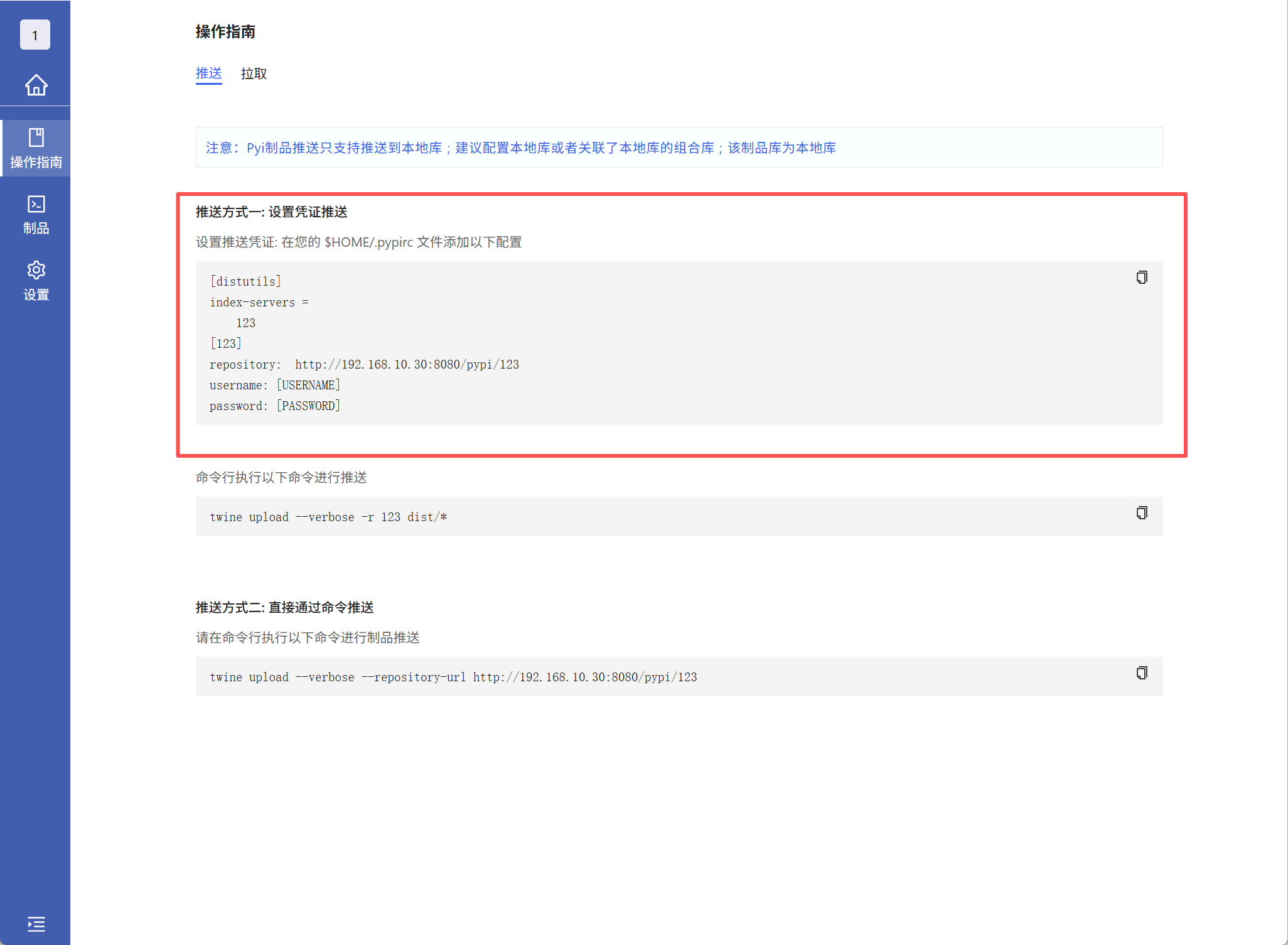 - 设置凭证:进入制品库界面点击右上角操作指引选择Pypi进入操作指引界面,替换对应的文本。将其添加至$HOME/.pypirc文件中。