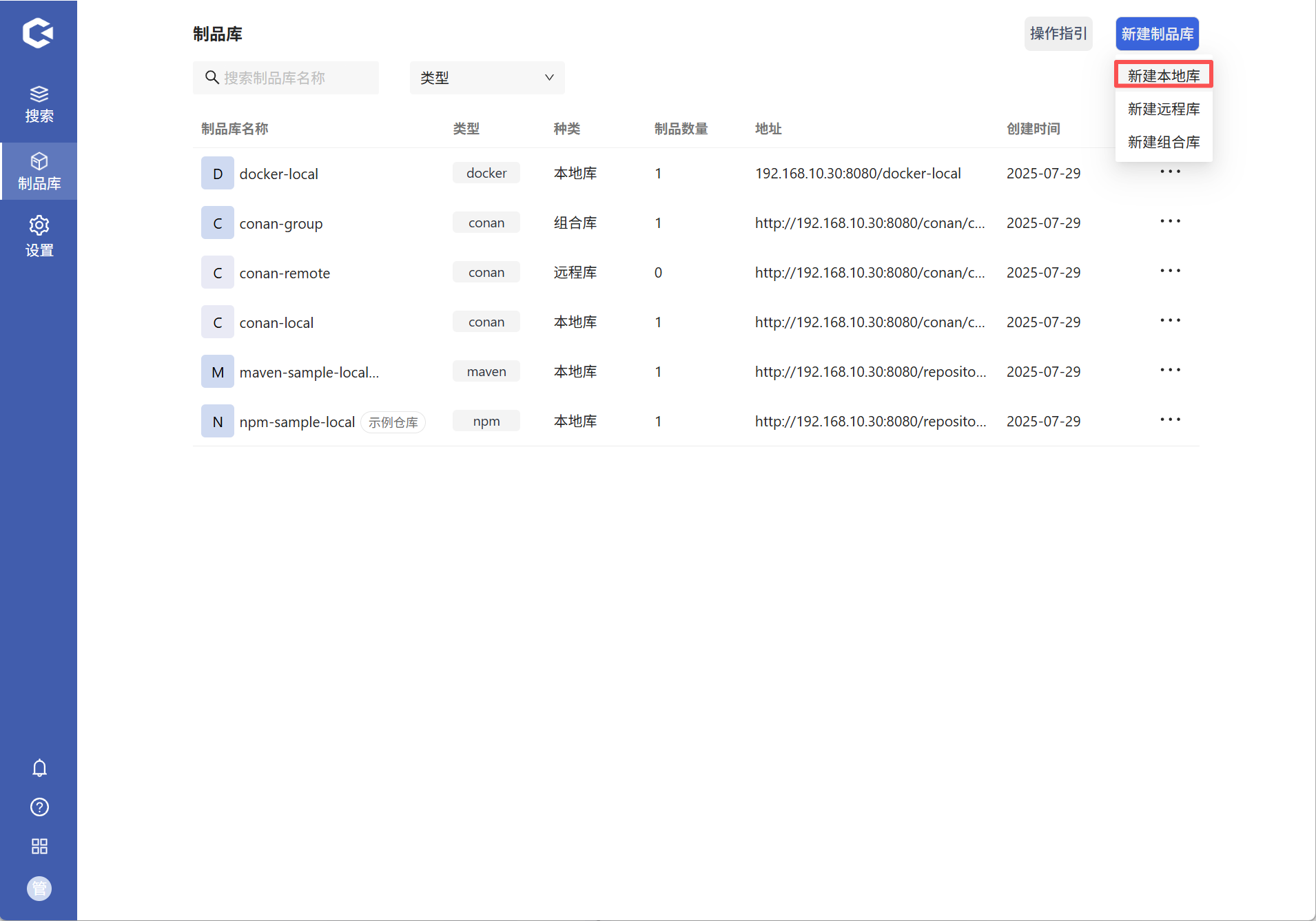 - 打开创建本地库界面:点击新建制品库选择新建本地库添加信息点击确认