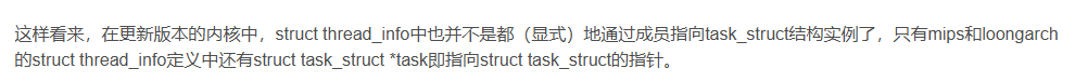 实际上早期内核3.X版本中,x86、ARM下的thread_info 里也有task_struct的指针,后续版本被删除,具体原因到后面介绍“current”宏时再详细介绍。
