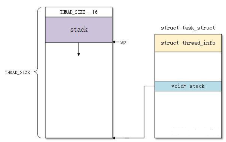 如上图所示,由于thread_info和stack是共用体,thread_info的地址就是栈所在页框的基地址。因此当我们获得当前进程内核栈的sp寄存器存储的地址时,根据THREAD_SIZE对齐就可以获取thread_info结构的基地址。