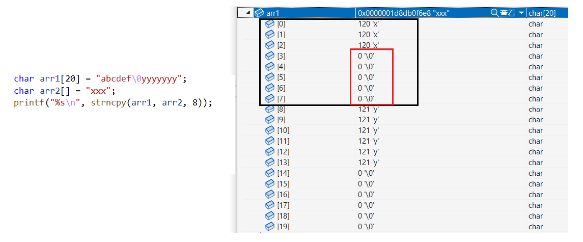 1.2.2 会将源字符串中的'\0'拷贝到目标空间中。