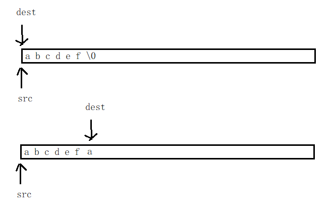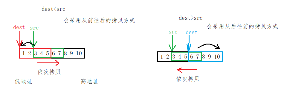 {assert(dest && src);void* ret = dest;if (dest < src){//从前往后拷贝while (num--){*((char*)dest) = *((char*)src);dest = (char*)dest + 1;src = (char*)src + 1;}}else{//从后往前拷贝while (num--){*((char*)dest+num) = *((char*)src+num);}}return ret;