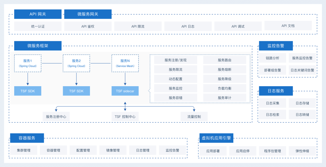 腾讯微服务平台(Tencent Service Framework,TSF)是一个围绕着应用和微服务的 PaaS 平台,提供应用全生命周期管理、服务注册配置治理、数据化运营、立体化监控等功能。TSF 拥抱 Spring Cloud 、Service Mesh 微服务框架,帮助企业客户解决传统集中式架构转型的困难,打造大规模高可用的分布式系统架构,实现业务、产品的快速落地。针对原生 Spring Cloud 应用与 Mesh 方式零成本接入。