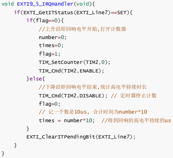 这里的flag变量适用于记录中断信号是上升沿还是下降沿,由于每次测量都需要重置定时器产生中断的次数,因此这里的传播时间和中断次数都要先赋值为0。