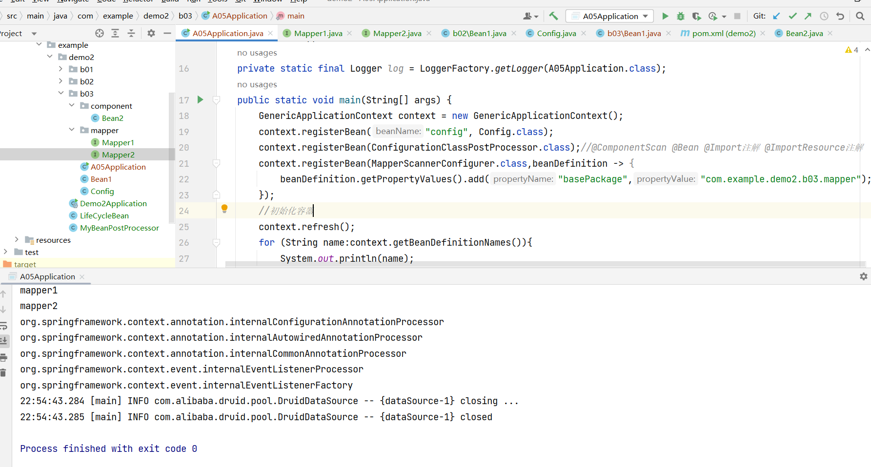 context.registerBean(MapperScannerConfigurer.class,beanDefinition -> {beanDefinition.getPropertyValues().add("basePackage","com.example.demo2.b03.mapper");});