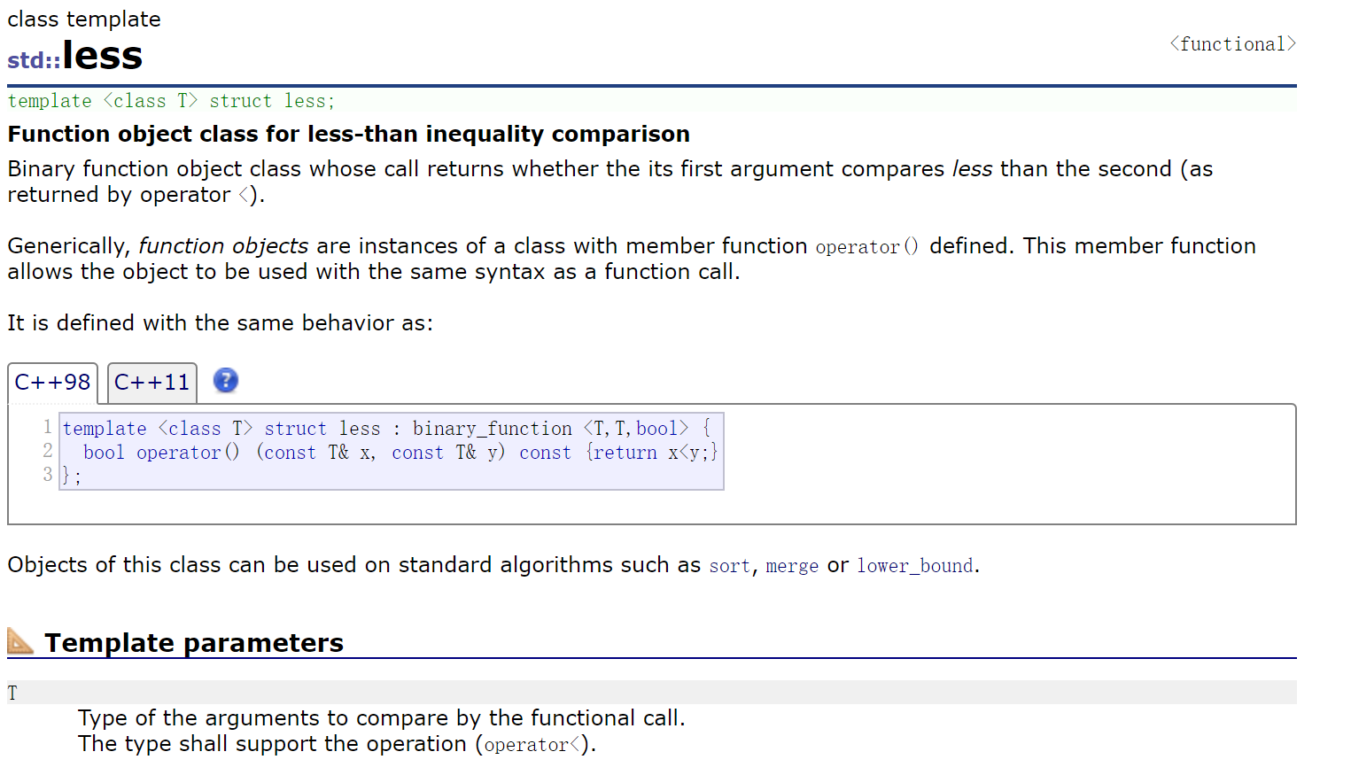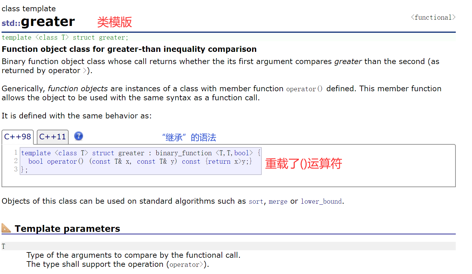 - 对于不支持比较大小的类型(没重载 <、>),可以制订一些仿函数。