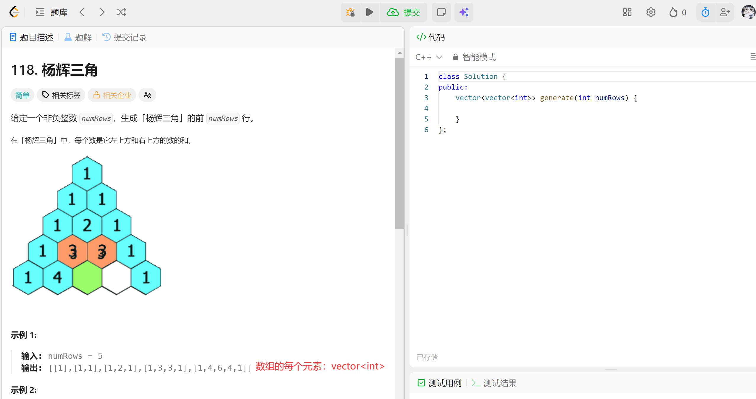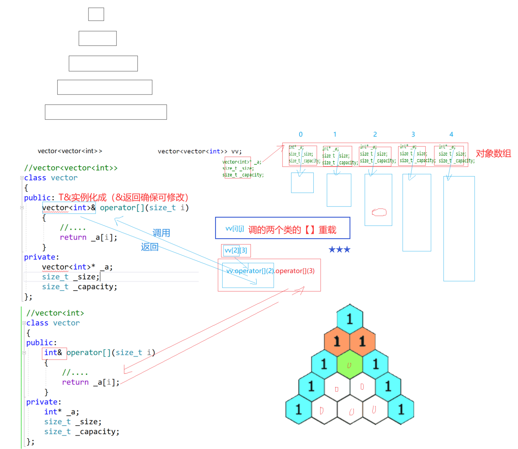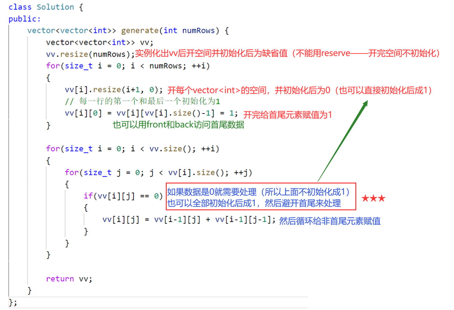 public:vector<vector<int>> generate(int numRows){ //实例化对象vector<vector<int>> vv(numRows);//已经在构造阶段把外层 vector 的 size 设成 numRows 了;//再调用一次 vv.resize(numRows) 只是重复地把 size 从 numRows 改成 numRowsfor(int i = 0; i < numRows; ++i) //n行{vv[i].resize(i+1, 1); //给每行开空间,开的空间都初始化为1}for(int i = 2; i < numRows; ++i) //i = 2,从第3行开始调整{for(int j = 1; j < i; ++j) //j = 1,从第3行的第2个元素开始调整{vv[i][j] = vv[i-1][j] + vv[i-1][j-1];}}return vv;}