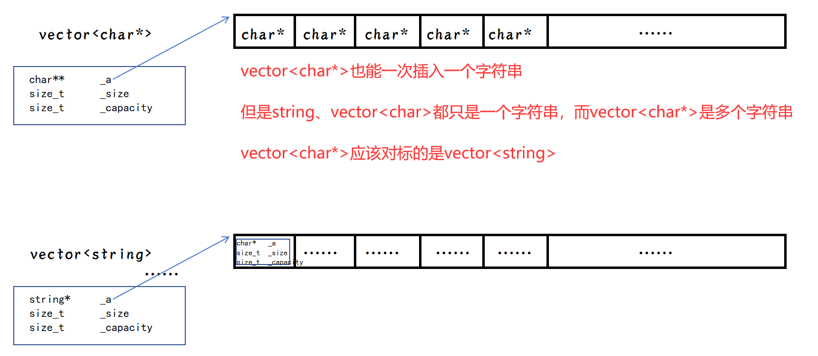 - vector<char*>:char*就代表数组里存的就是一个一个的指针、或者说一个一个的字符串