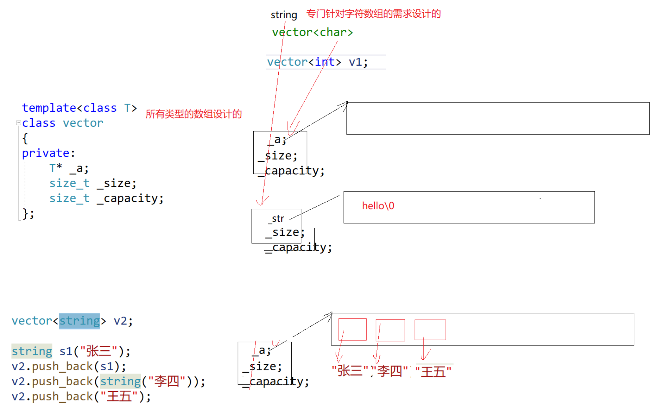 - string和vector<char>在底层几乎一模一样,只是同样是存储hello,vector<char>里面就只有hello,string里面还有\0。