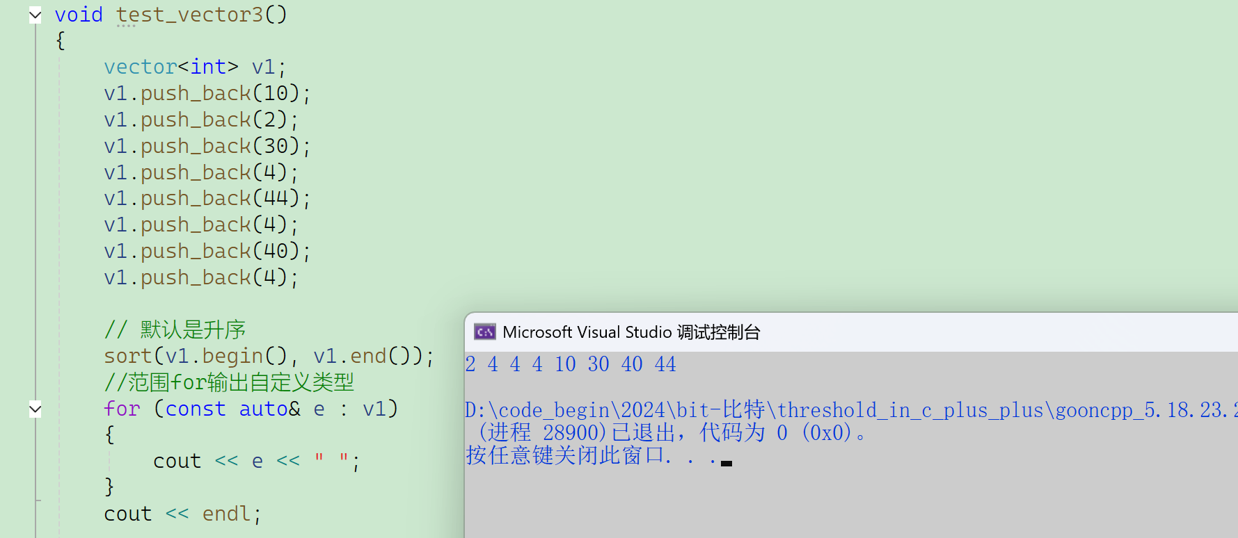 {vector<int> v;size_t sz = v.capacity();v.reserve(100); // 提前将容量设置好,可以避免一遍插入一遍扩容cout << "making bar grow:\n";for (int i = 0; i < 100; ++i) {v.push_back(i);if (sz != v.capacity()){sz = v.capacity();cout << "capacity changed: " << sz << '\n';}}
