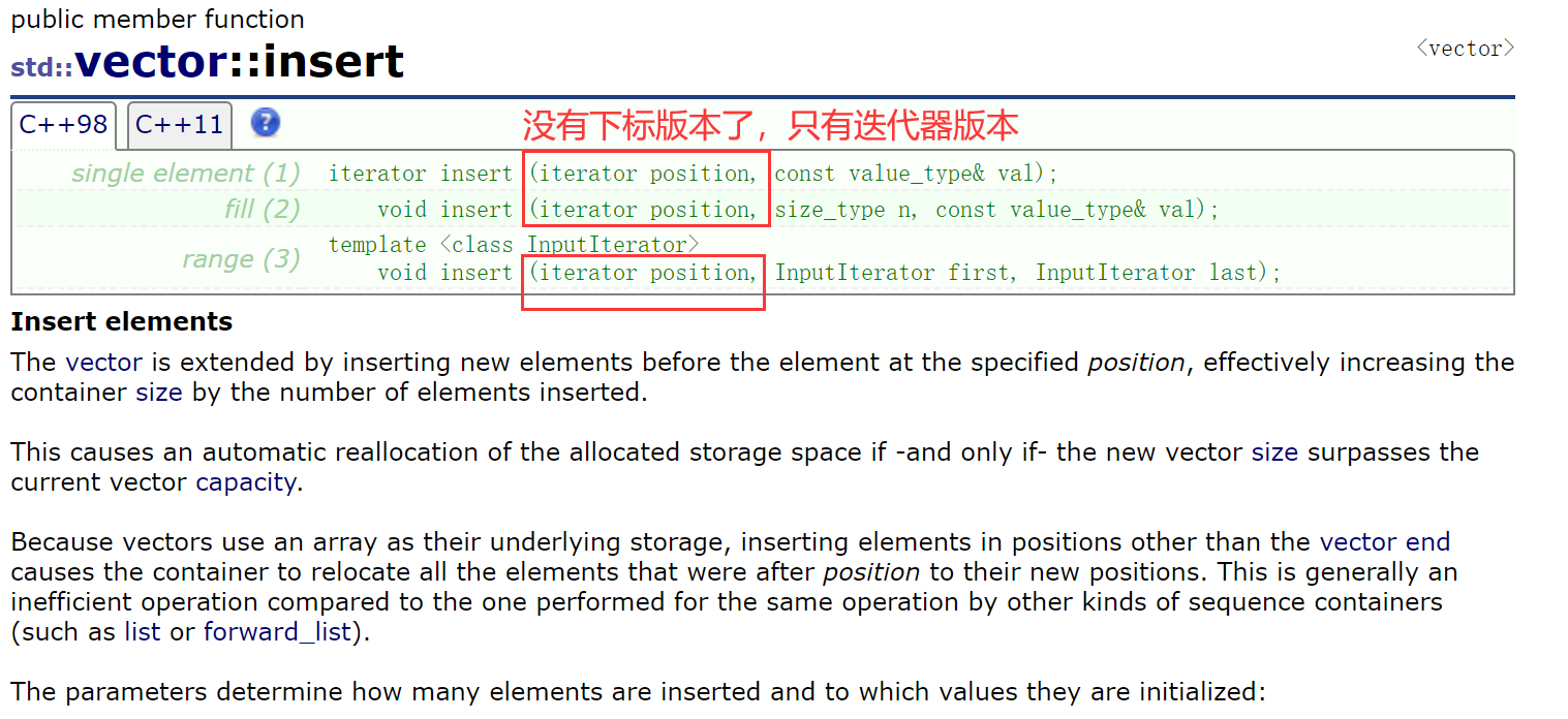 - vector实现的顺序表是针对所有的数组,其成员函数插入就只有一个一个地插入,对字符数组就不方便。
