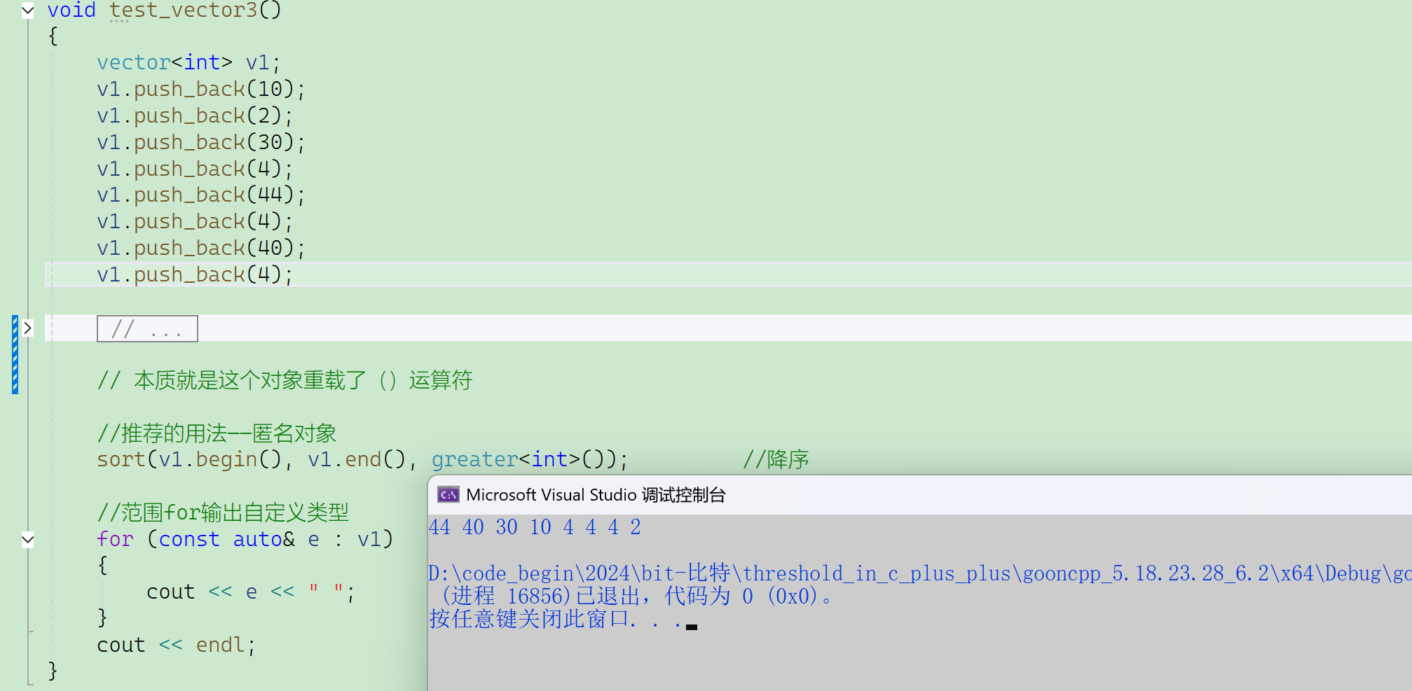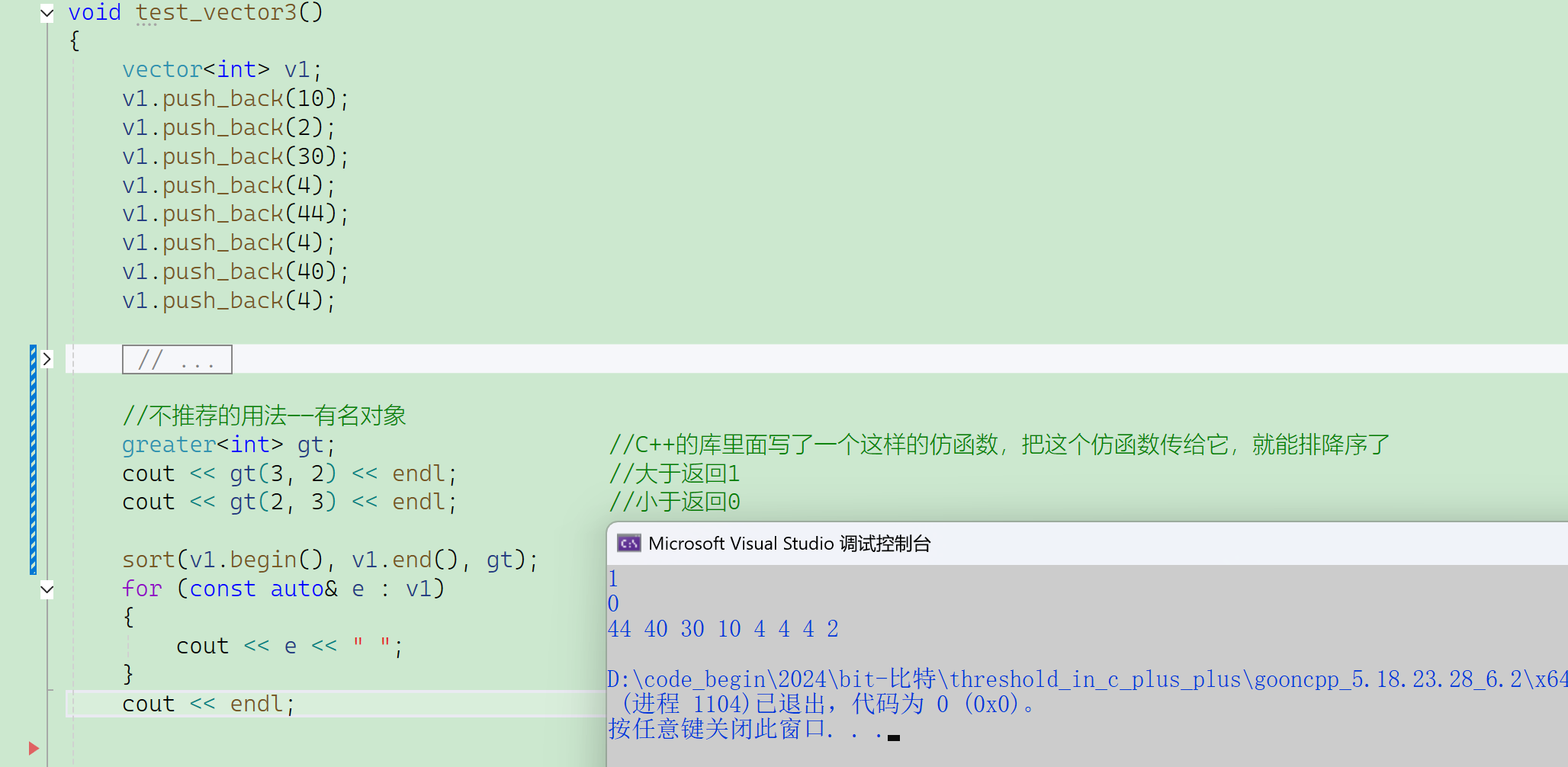 仿函数是一个greater<int>类型的对象,名字gt是随便取的,greater这个类型可以支持两个数的比较,大于返回1,小于返回0。