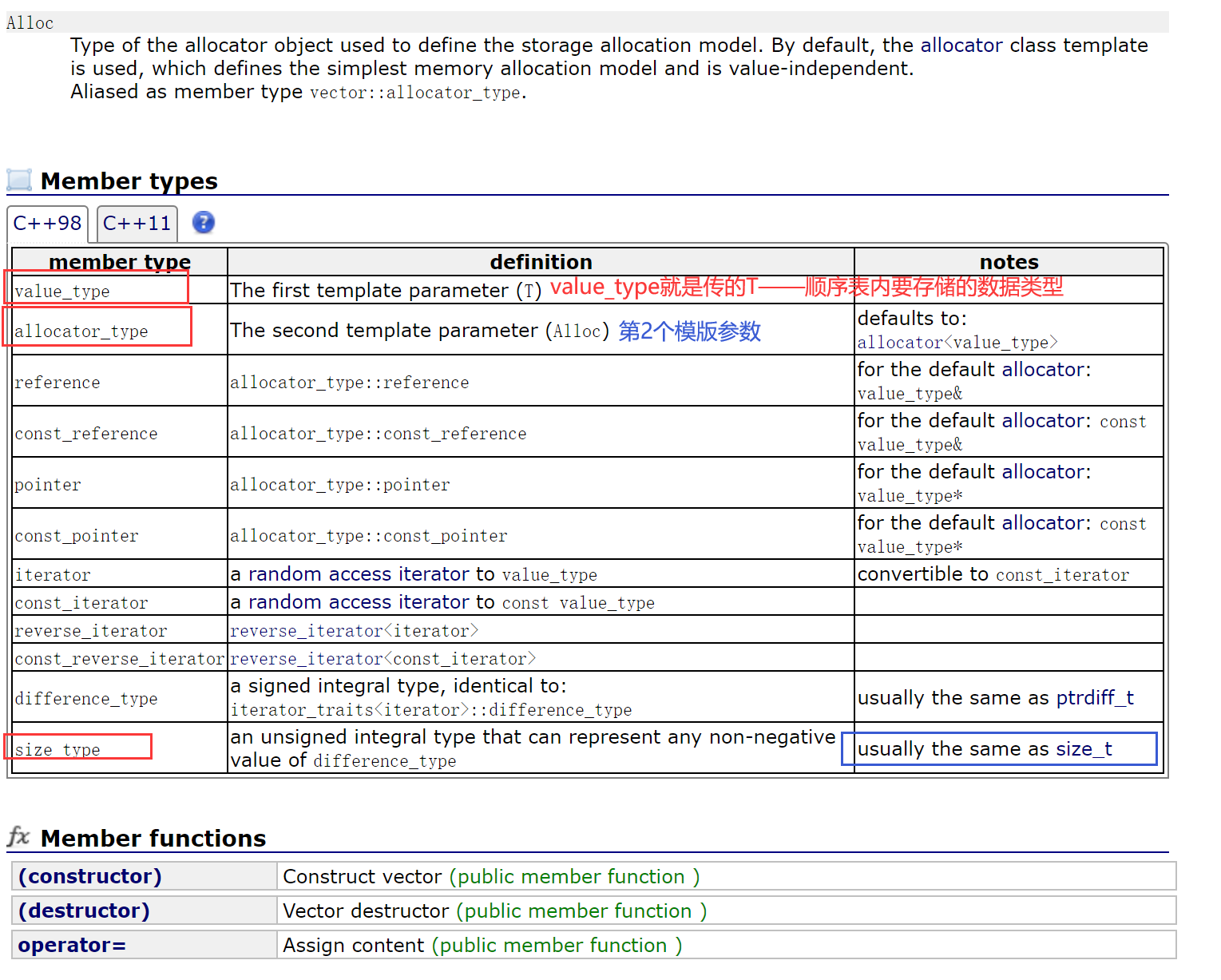 这里给出了,在vector这个类里面,(定义)使用到的一些 成员类型 。
