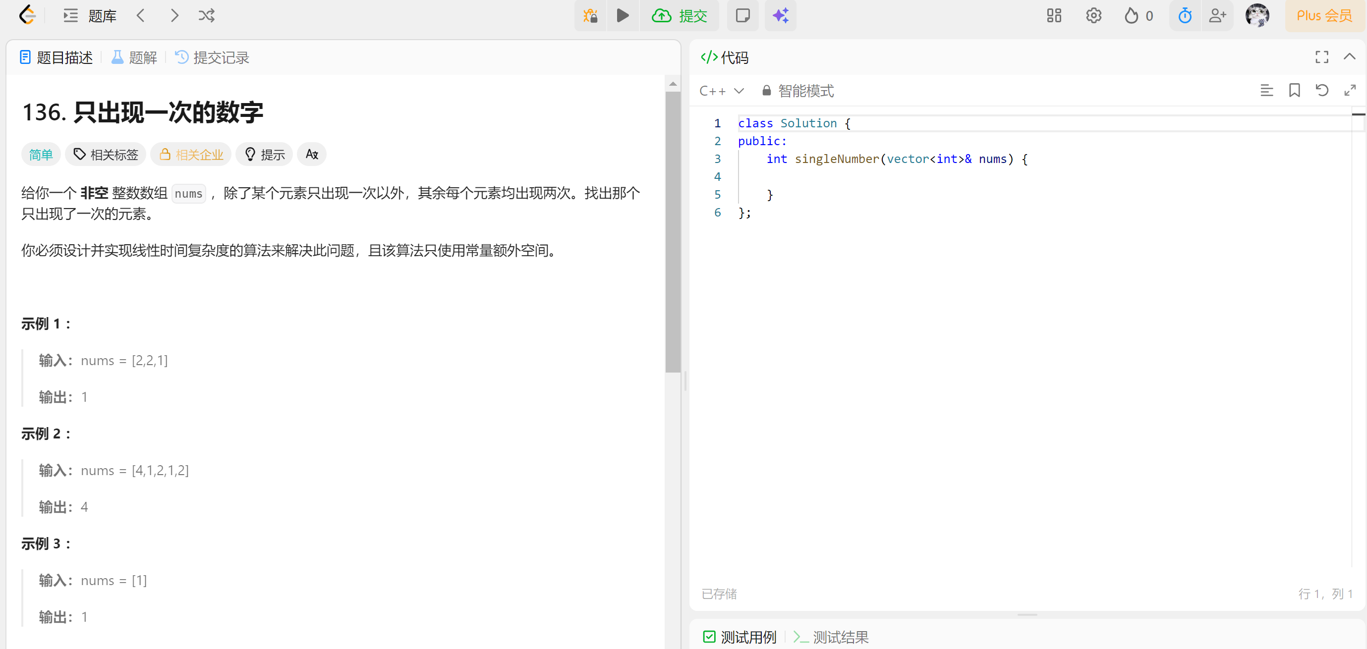 public:int singleNumber(vector<int>& nums) //引用传参:减少拷贝{int value = 0;for(auto e : v) //范围for{value ^= e; //异或}return value;}