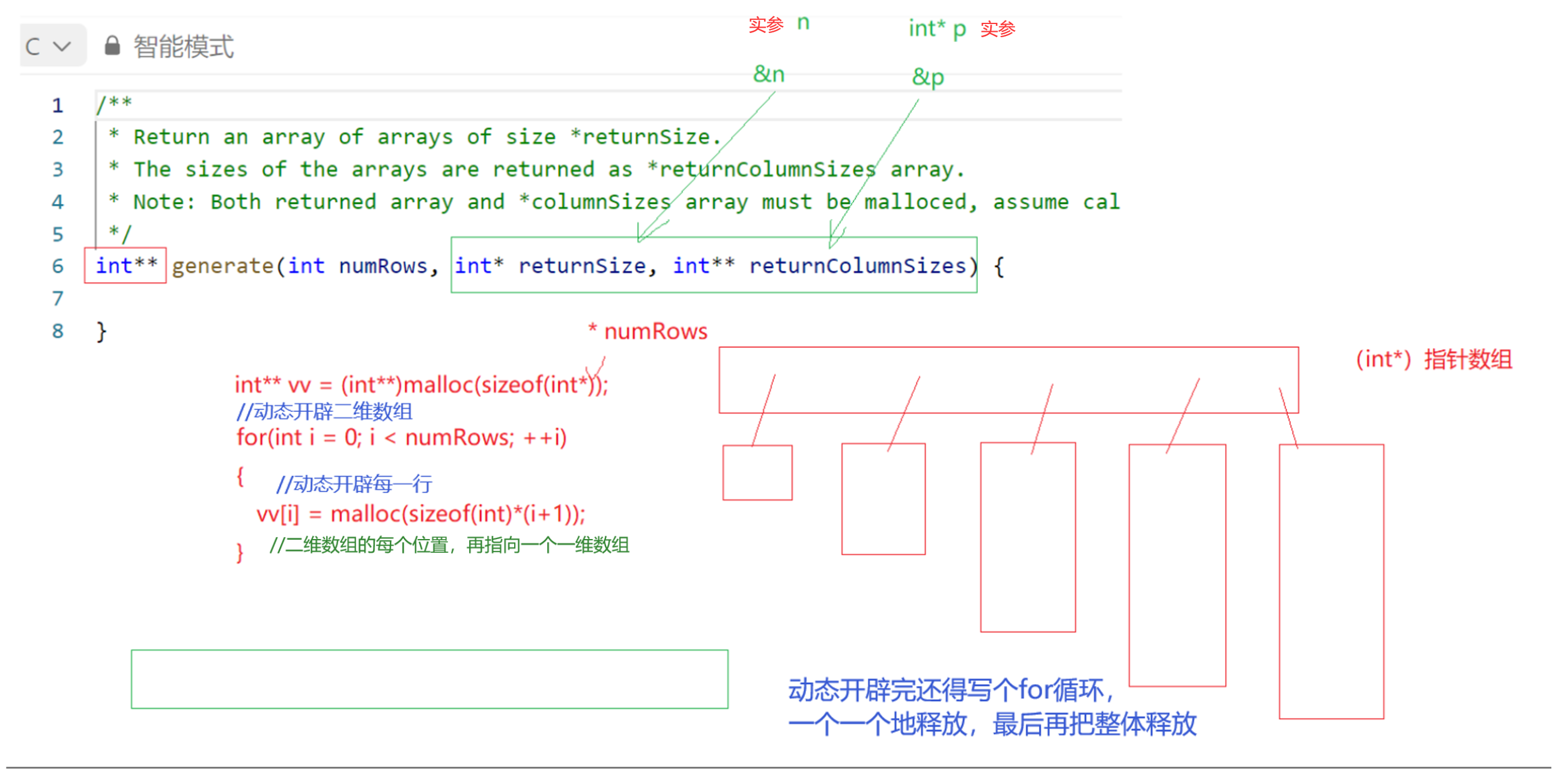 - 先开出整体的元素个数:每个元素是int*,需要numRows个元素;