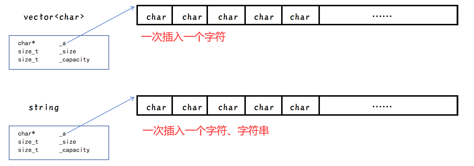 - string和vector<char>主要是接口上的区别,string有很多针对字符串的接口。