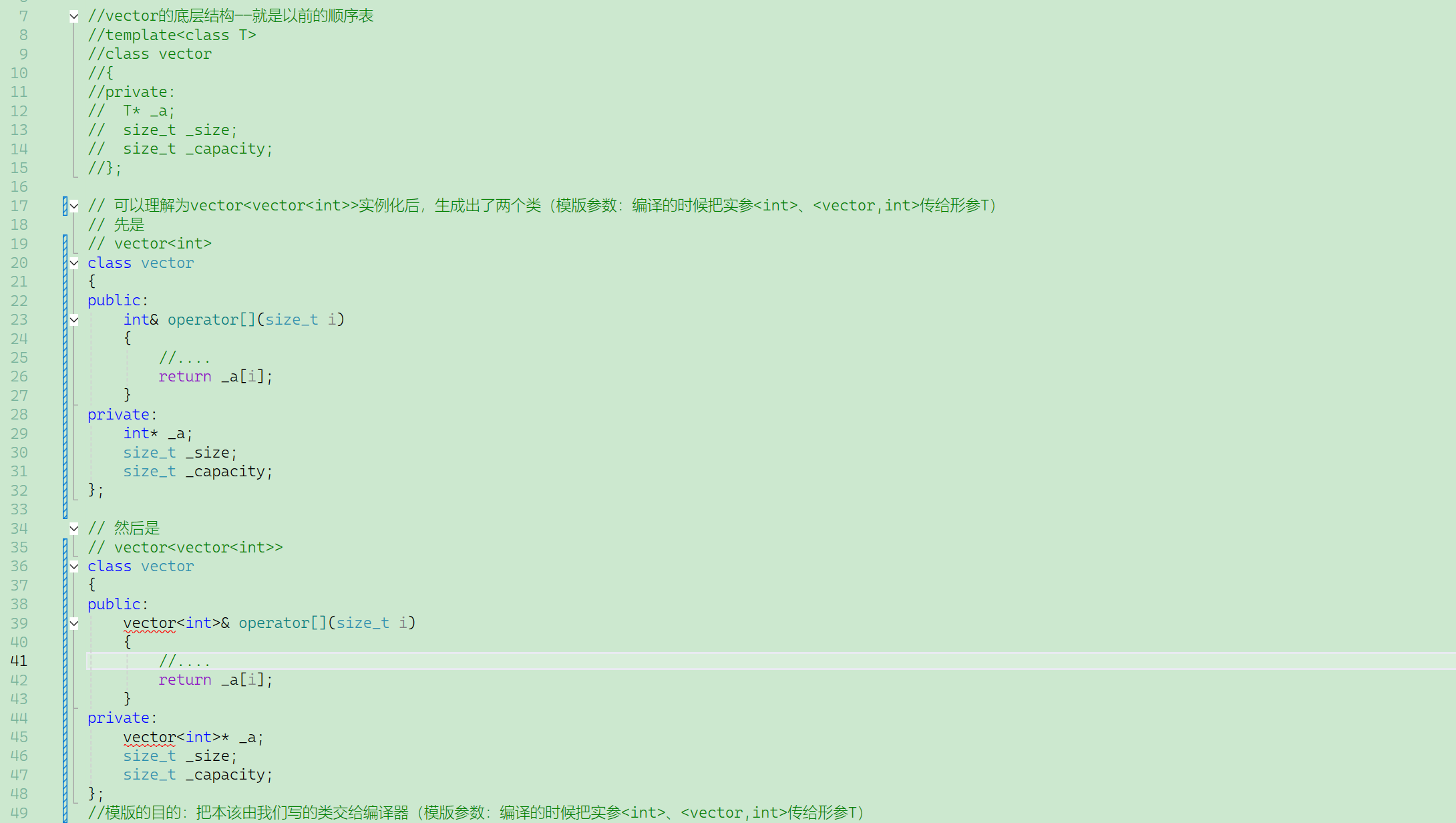 //用类模版来实例化对象 vector<double> v2; //类模版是写给编译器的,写一个泛型编程,把vector实现成类模版,里面的数据类型不是写死的 //你指定存double,编译器再去实例化出一个double的vectorvector<string> v2; //给这个模版参数对应的类型,编译器就会生成对应类型的数组