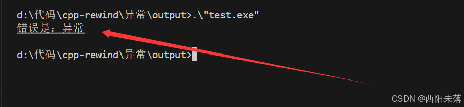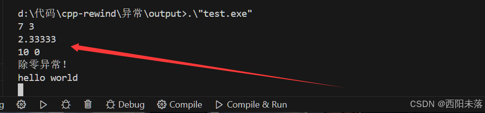 我们这个代码实现的是“除零异常的判断”,它会在调用链中寻找到匹配的处理异常的catch,最终会找到我们的main函数中的catch并进行处理,然后执行后续的代码。
