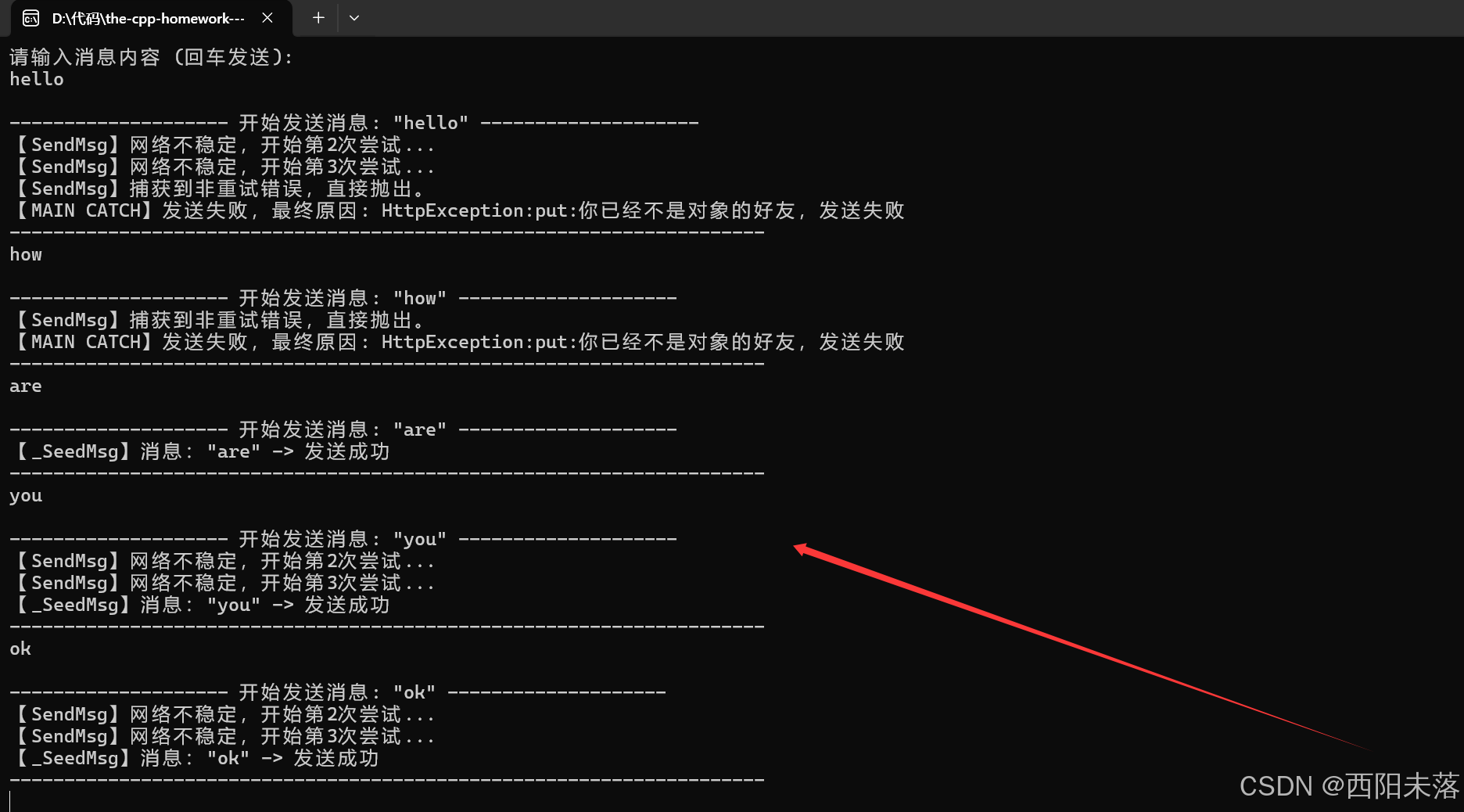 {// 1. 模拟网络不稳定错误 (错误ID: 102),大约 50% 概率if (rand() % 2 == 0){throw HttpException("网络不稳定,发送失败", 102, "put");}// 2. 模拟好友关系错误 (错误ID: 103),大约 1/7 概率else if (rand() % 7 == 0){throw HttpException("你已经不是对象的好友,发送失败", 103, "put");}// 3. 成功发送else{cout << "【_SeedMsg】消息:\"" << s << "\" -> 发送成功" << endl;}