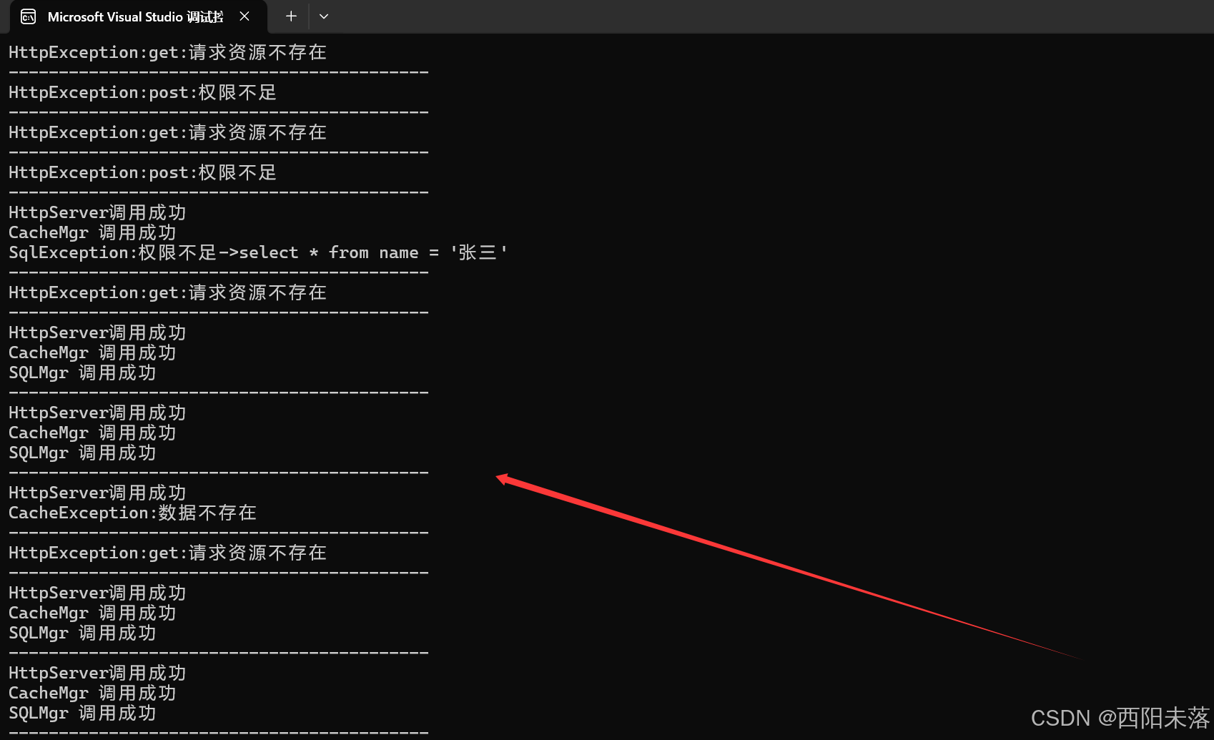 {// 大约 1/3 或 1/4 的概率抛出 HttpExceptionif (rand() % 3 == 0){throw HttpException("请求资源不存在", 100, "get");}else if (rand() % 4 == 0){throw HttpException("权限不足", 101, "post");}else{cout << "HttpServer调用成功" << endl;}// 调用下一层函数,可能会抛出 CacheException 或 SqlExceptionCacheMgr();