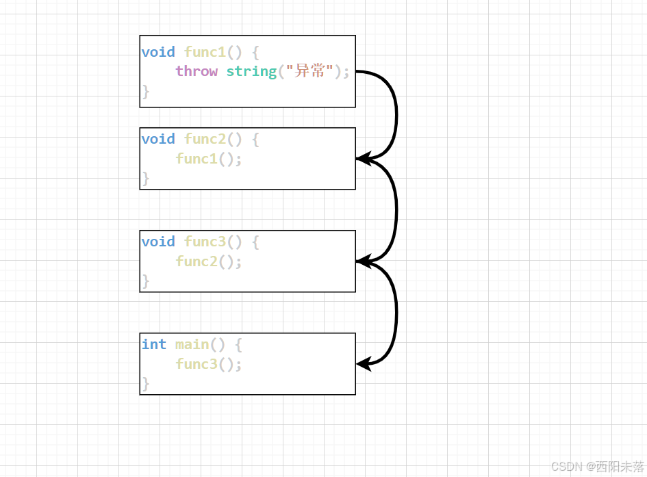 - 我们这里首先会检查一下throw本身是不是在try块的内部,这里发现不在,所以我们会退出func1所在的函数栈,继续向上一个函数栈中进行查找,也就是我们的func2所在的函数栈。