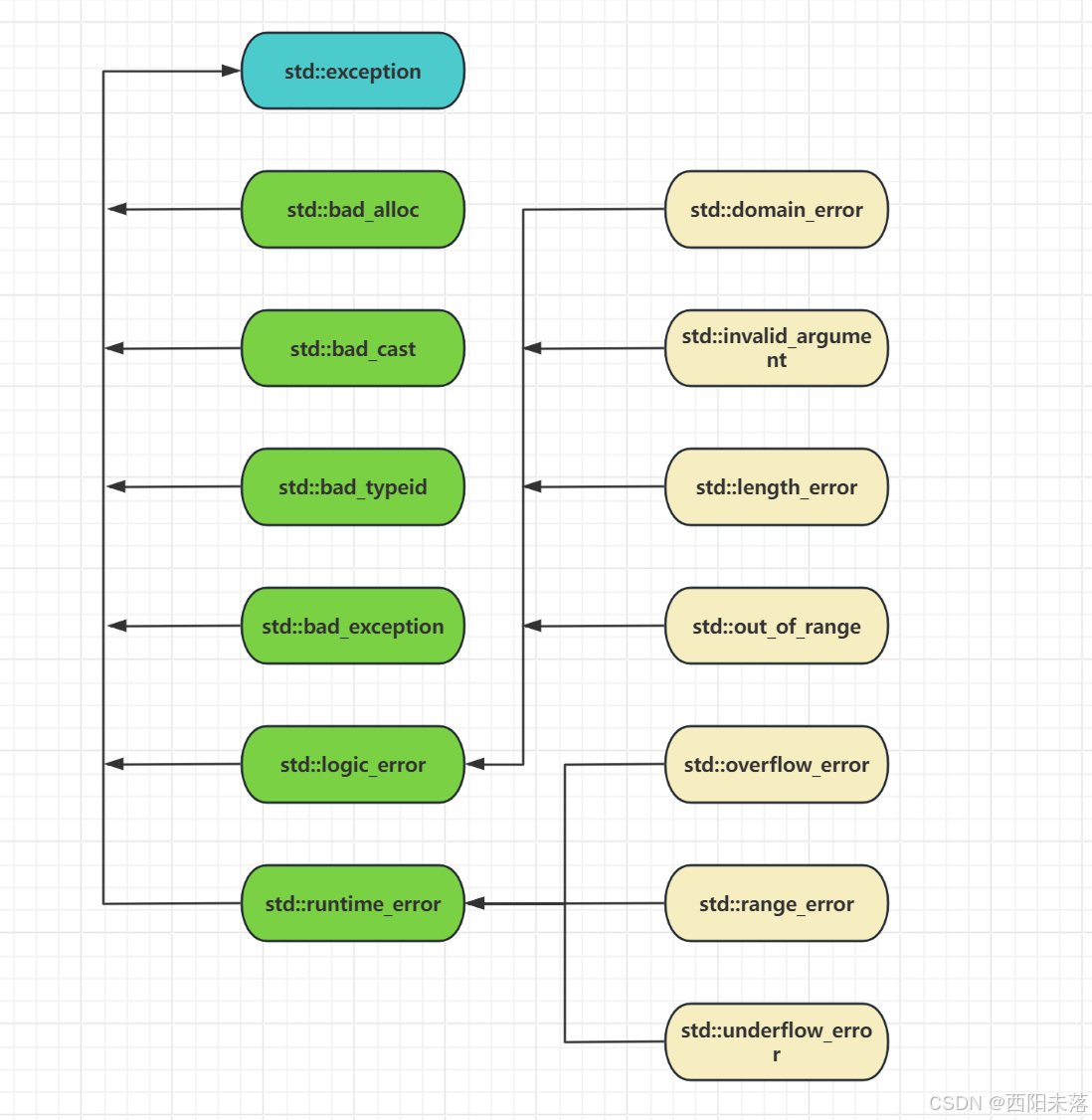 C++标准库中也定义了自己的一套比较完整的异常继承体系库,基类就是std::exception,所以我们日常自己写程序的时候,只需要在主函数中捕获std::exception即可,要获取相对应的异常信息就需要调用我们的what函数(标签)。继承关系如图: