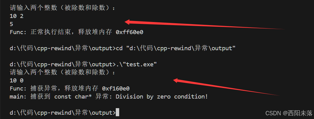 {int* array = new int[10];try {int len, time;cout << "请输入两个整数(被除数和除数):" << endl;if (!(cin >> len >> time)) {throw string("Input reading failed!");}cout << Divide(len, time) << endl;}catch (...) {// 捕获异常后的首要任务:释放内存,防止内存泄漏cout << "Func: 捕获异常,释放堆内存 " << array << endl;delete[] array;// 异常重新抛出,交给外层(main函数)处理// 捕获到什么类型的异常就重新抛出什么类型throw; }// 正常执行流程:如果 try 块没有抛出异常,执行到这里释放内存cout << "Func: 正常执行结束,释放堆内存 " << array << endl;delete[] array;