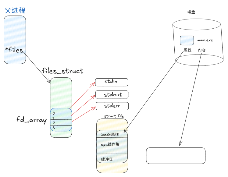 上面说到,匿名管道通信用于父子进程间的通信,接下来我们讲解匿名管道的原理,就能理解为什么它只能用于父子进程间的通信了。现在模拟父进程打开一个文件main.exe